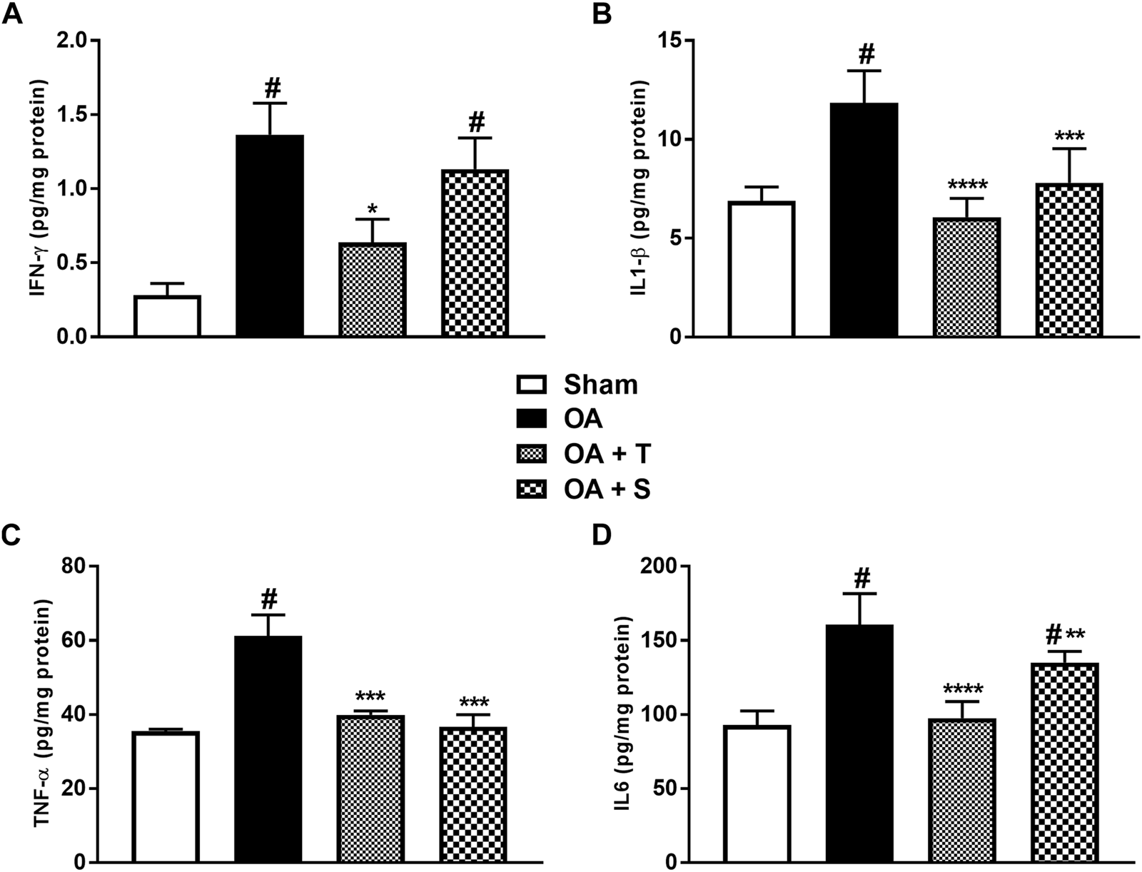 Pro-inflammatory cytokines. (A) IFN-ʎ; (B) IL1-β; (C) TNF-α; (D) IL6. Abbreviations: IL, interleukin; IFN, interferon; OA, osteoarthritis; TNF, tumor necrosis factor. Data are presented as mean ± SEM, in which: #p < 0.05 vs. Sham Group; *p < 0.05 vs. OA Group; **p < 0.01 vs. OA Group; ***p < 0.001 vs. OA Group; ****p < 0.0001 vs. OA Group; (One-way ANOVA followed by Tukey post-hoc test).