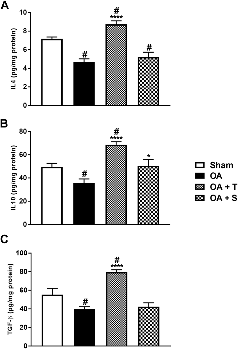 Figure 6 shows the levels of anti-inflammatory cytokines IL4, IL10, and TGF-β. In 6A, it is observed a significant decrease of IL4 in the OA, OA + T, and OA + S groups in relation to Sham (p < 0.05), while the OA + T group showed a significant increase in IL4 levels when compared to the OA group (p < 0.0001). In 6B it is observed a significant decrease of IL10 in the OA group in relation to Sham (p < 0.05) and increase of IL10 in OA + T group in relation to OA group (p < 0.0001). In Figure 6C it is observed a significant decrease in TGF-β in the OA and OA + S groups compared to the Sham group, while the OA + T group showed a significant increase in TGF-β levels when compared to the OA group (p < 0.0001).