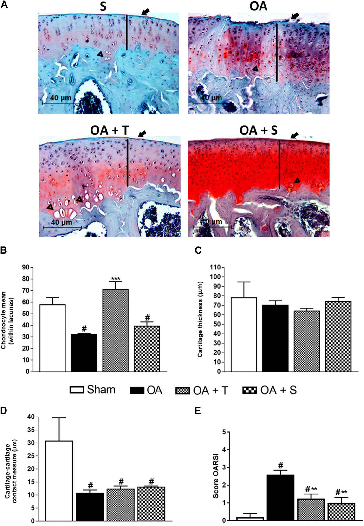 In Figure 7A, there are representative images of the histological analysis. In Figure 7B, we evaluated the mean number of chondrocytes inside the lacuna (40 µm). We observed that the OA and OA + S groups showed a significant decrease in the number of chondrocytes per lacuna when compared to the Sham group (p < 0.05). On the other hand, the OA + T group showed a significant increase in chondrocytes per lacuna when compared to OA group (p < 0.001). In Figure 7C, no significant change was observed between the groups in terms of cartilage thickness. In Figure 7D, in the cartilage-cartilage contact measure, the OA, OA + T, and OA + S groups showed statistically significant reductions when compared to Sham (p < 0.05).