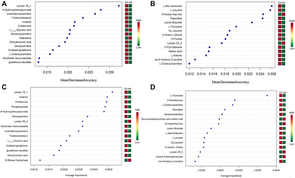 The metabolites with variable importance in projection (VIP) > 1.5 and p < 0.01 and fold change ≥ 2 or FC ≤ 0.5 were chosen and comparisons made among each group using RF (Figures 6A,B) and SVM (Figures 6C,D) to screen the top 15 metabolites. After combined analysis of the two machine algorithms, the representative difference products between the CA and HA groups were L-(−)-glyceric acid (L-GA), imatinib (IMA), lysoPC 16:1 (Lyp 16:1), oleoylcarnitine, 4-hydroxyphenylpyruvate (4-HPPA), D-mannose, arachidonoylcarnitine, glutathione disulfide, GSSG, dehydrocholic acid (DHCA), and nicotinate ribonucleoside (NAR). The representative difference products between the CV and HV groups were piperidine (PIP), O-acetyl-L-serine (OAS), N-acetyl-asp-glu (NAAG), lysoPC 20:0 (Lyp 20:0), lysine butyrate, L-T4, L-octanoylcarnitine, L-leucine (L-Leu), L-allo-isoleucine(L-allo-Ile), DL-leucine(DL-Leu), cis-4-hydroxy-D-proline (4-D-Hyp), and 2-pyrrolidinone (2-P). We combined RF and SVM to screen out relevant metabolites and estimate AUC values (Table 1).