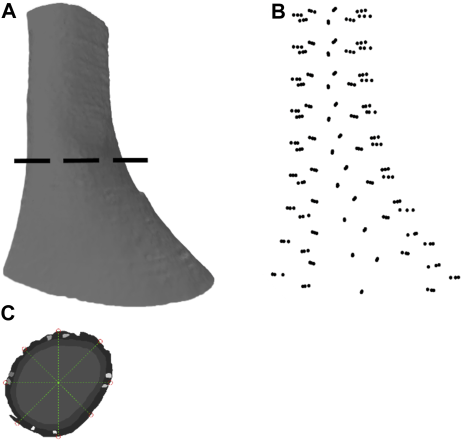 Image segmentation and anatomical model development based on an ultra-mill image dataset of human LES. (A) Lateral view of the human LES region, generated through ball pivoting algorithm surface reconstruction performed on the data cloud. (B) A data cloud of points obtained from node selection. (C) Demarcation of the nodes from the selected points around a segmented section.