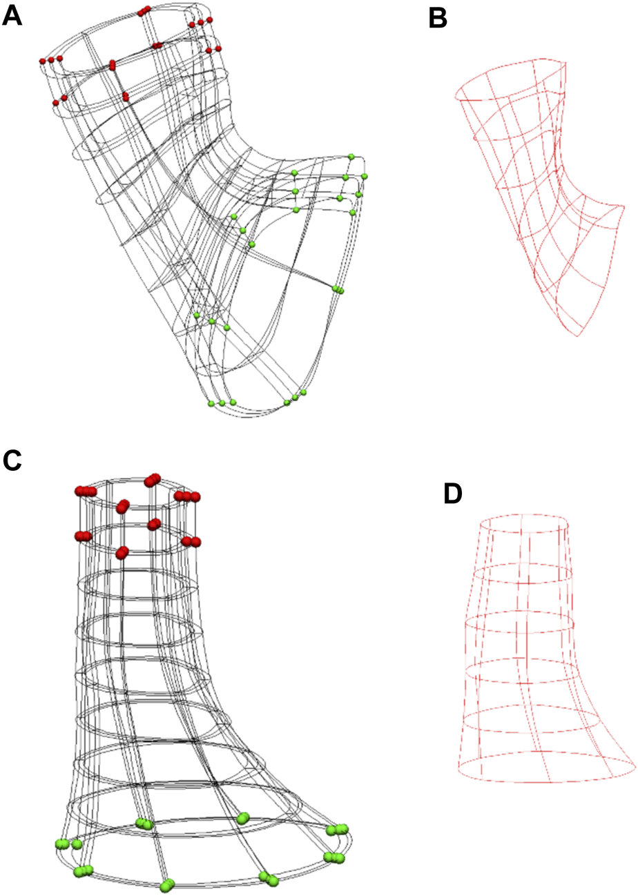 Anatomical models of the Ultra-mill and Visible Human meshes, and their simulation setups. (A) The setup of the previously developed Visible Human model (Yassi et al., 2009). (B) The Visible Human model cavity mesh. (C) The equivalent LES model reconstructed from the Ultra-mill dataset. (D) The Ultra-mill data cavity mesh. Boundary conditions are visualized as spheres. Green spheres are fixed in all directions. Red spheres are a grouping of nodes fixed in either the x-z or y-z directions. Applied boundary conditions help to reduce torsion, while allowing contraction.