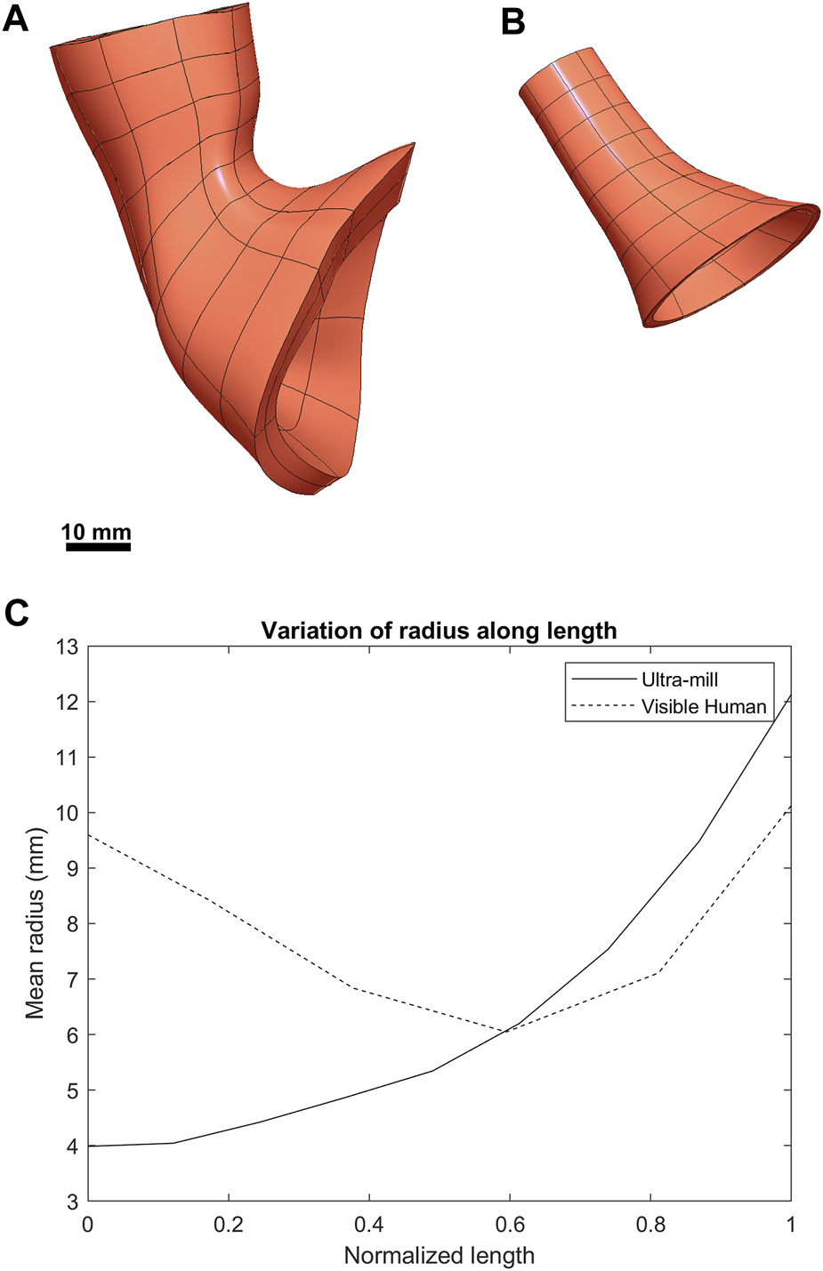 Visual comparison between the two anatomies. (A) The previously developed Visible Human LES mesh (Yassi et al., 2009). (B) The LES mesh made from the ultra-mill dataset. (C) Comparison of the average radius of both meshes along their normalized lengths.