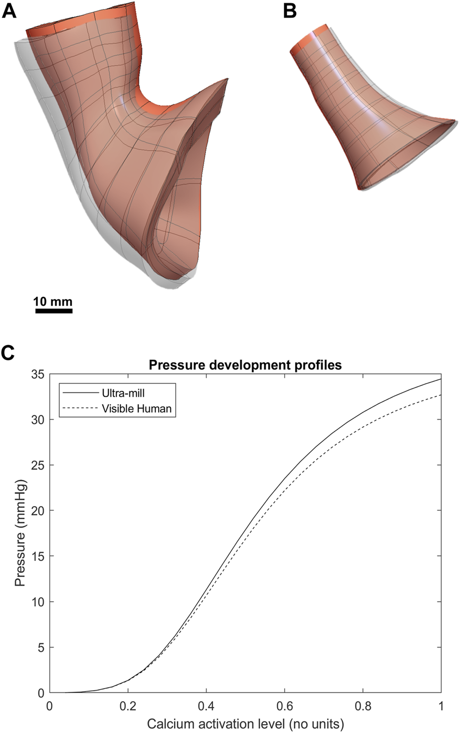 Comparison between the post-contraction behavior of both models. The contracted geometries are visible as greyscale superpositions of the undeformed orange meshes. (A) The Visible Human mesh before and after contraction. (B) The Ultra-mill meshes before and after contraction. (C) The pressure development profiles of the two anatomies over range of muscle activation levels.
