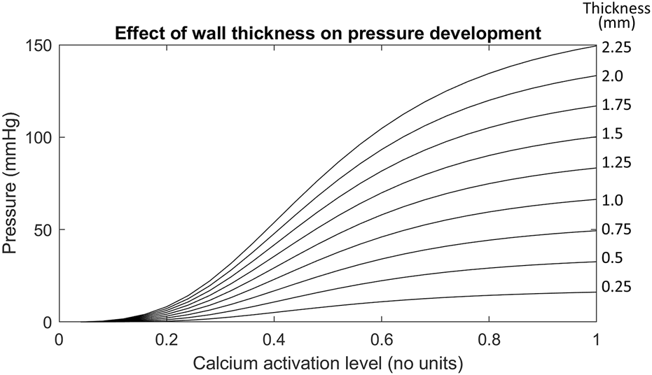 The importance of individual muscle layer activation was investigated previously (Yassi et al., 2009), so the present study focused on the impact of total muscle thickness on intraluminal pressure development, which had the greatest impact out of all the anatomical considerations (Figure 6). In this case, it was likely that the passive-resistive forces started to become significant due to larger strains being produced. Higher strains from thicker muscular walls may induce greater stresses in the radial direction, increasing stresses applied to the cavity mesh, which could have contributed to the increase in the gradient of pressure to the wall thickness and the observed trend.