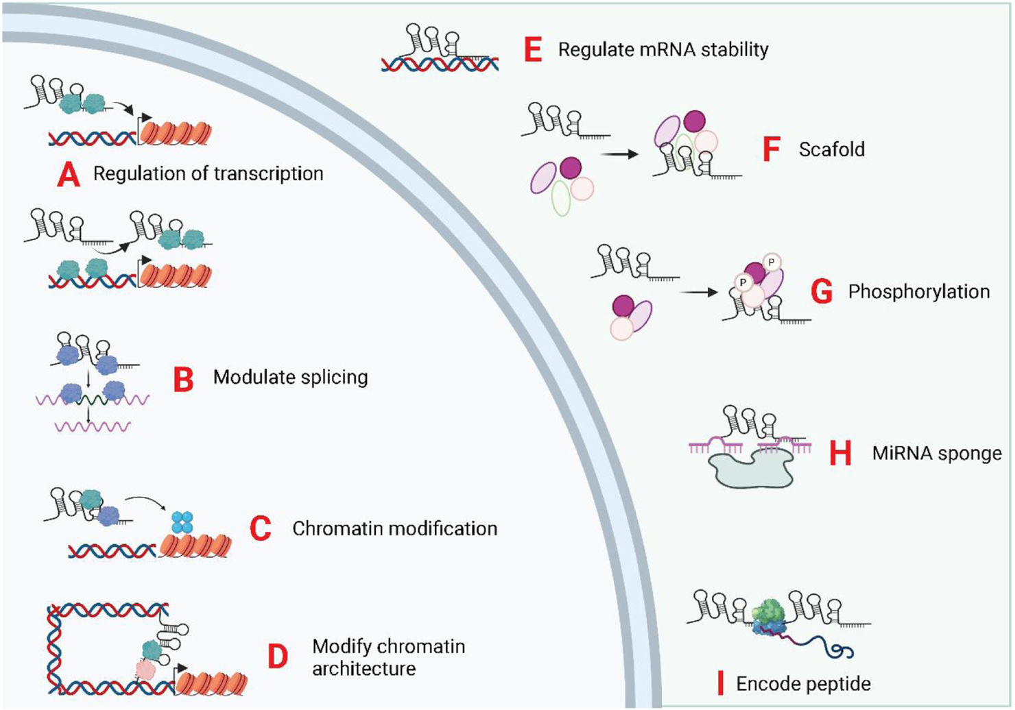 Biological functions of exosomal LncRNAs. The subcellular localization of LncRNA determines its biological functions. The exosomal, lncRNA were trasnported into the target cells and induce or repress gene transcription by directing transcription factors (A), controlling splicing of pre-mRNAs (B), mediating chromatin/histone modifications (C), and modifying chromatin structure (D). In the cytoplasm, lncRNAs can regulate mRNA stability (E), act as scaffolds for ribonucleoprotein complexes (F), mediate protein phosphorylation (G), act as miRNA sponges (H), and encode micropeptides (I).