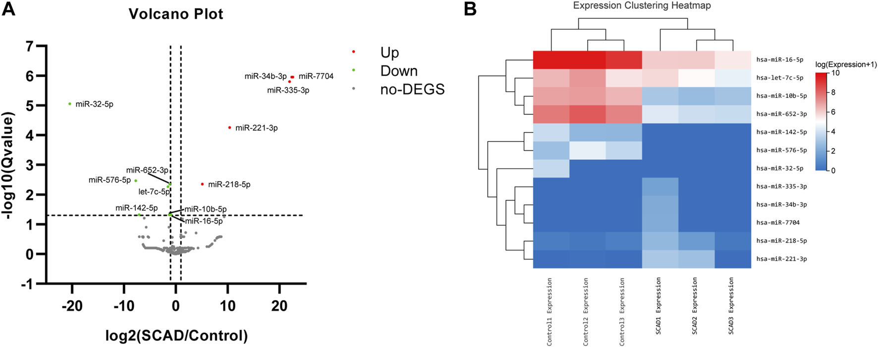 FIGURE 2. Exosomal DEmiRNAs obtained from small RNA sequencing, a total of 12 DEmiRNAs were found between SCAD patients and healthy controls (A) Volcano plot showing the statistically significant DEmiRNAs in the plasma exosomes of SCAD patients (n = 3) compared with control subjects (n = 3). The red and green points represent exosomal DEmiRNAs upregulated and downregulated with statistical significance, respectively (B) Heat map and hierarchical cluster analysis showing the relative expression of the exosomal DEmiRNAs. SCAD: stable coronary artery disease; no-DEGS: not differentially expressed genes; DEmiRNAs: differentially expressed miRNAs.