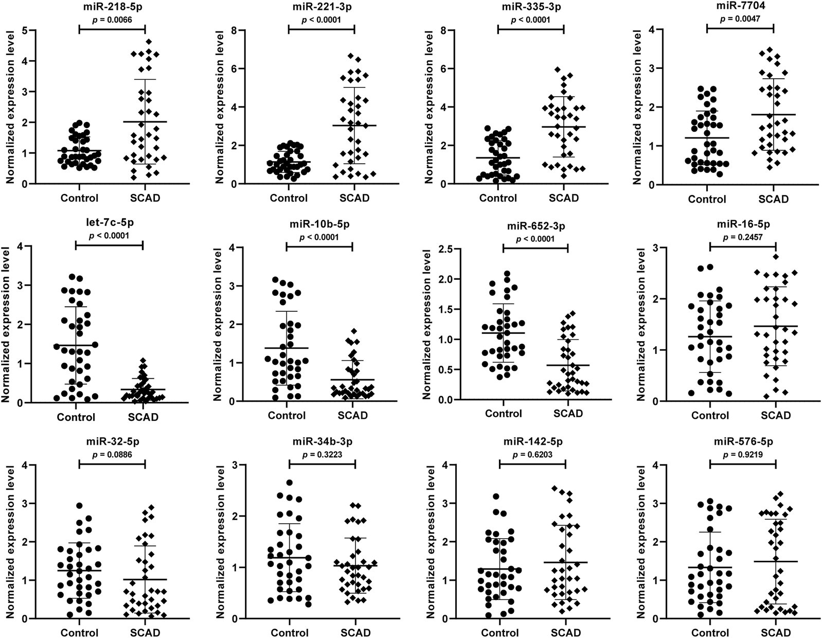 To further validate the 12 DEmiRNAs obtained from the small RNA-Seq, we performed qRT-PCR in the plasma exosomal miRNA samples of SCAD patients (n = 36) and healthy controls (n = 36). As shown in Figure 3, seven of the 12 DEmiRNAs were found to be differentially expressed. Compared with healthy controls, the levels of miR-218–5p, miR-221–3p, miR-335–3p, and miR-7704 were significantly upregulated and let-7c-5p, miR-10b-5p, and miR-652–3p were significantly downregulated in plasma exosomes of SCAD patients (p < 0.01). Nevertheless, no significant difference for miR-16–5p, miR-32–5p, miR-34b-3p, miR-142–5p and miR-576–5p between SCAD patients and healthy controls were observed (p > 0.05).