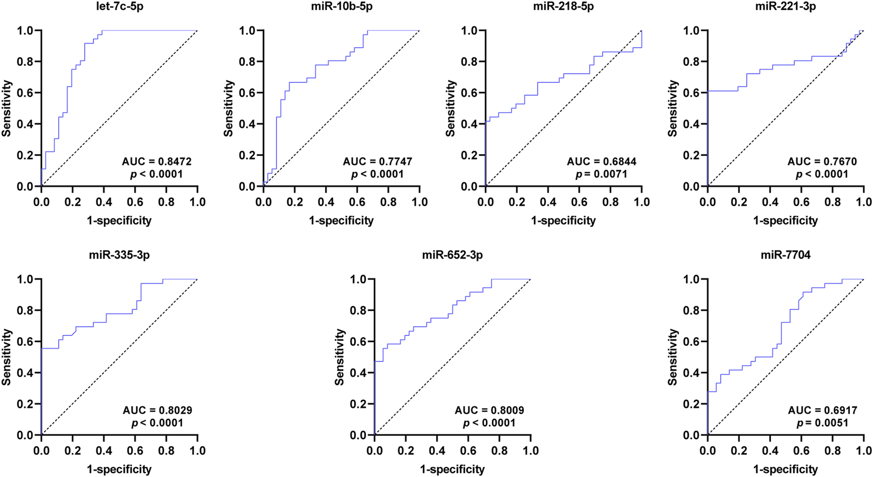 To assess the diagnostic value for SCAD, ROC curves were further constructed for the seven DEmiRNAs verified by qRT-PCR. As shown in Figure 4 and Table 2, the AUC values of exosomal let-7c-5p, miR-335–3p, miR-652–3p, miR-10b-5p, miR-218–5p, miR-221–3p, and miR-7704 were 0.8472, 0.8029, 0.8009, 0.7747, 0.6844, 0.7670, and 0.6917, respectively, indicating that exosomal let-7c-5p, miR-335–3p, and miR-652–3p whose AUC values are greater than 0.8 may serve as the best biomarkers for SCAD diagnosis.