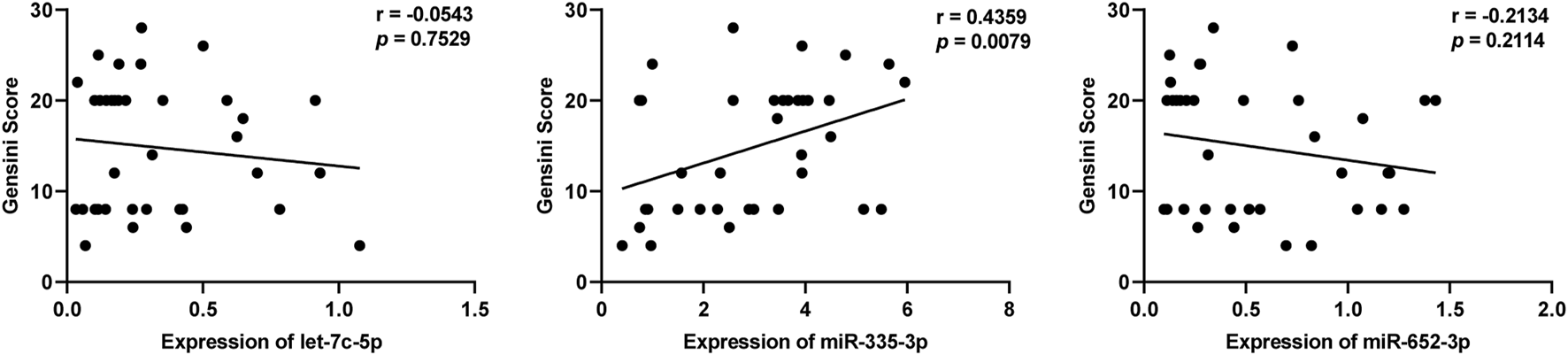 FIGURE 5. Correlation of plasma exosomal let-7c-5p, miR-335–3p, and miR-652–3 levels with Gensini scores in patients with SCAD.