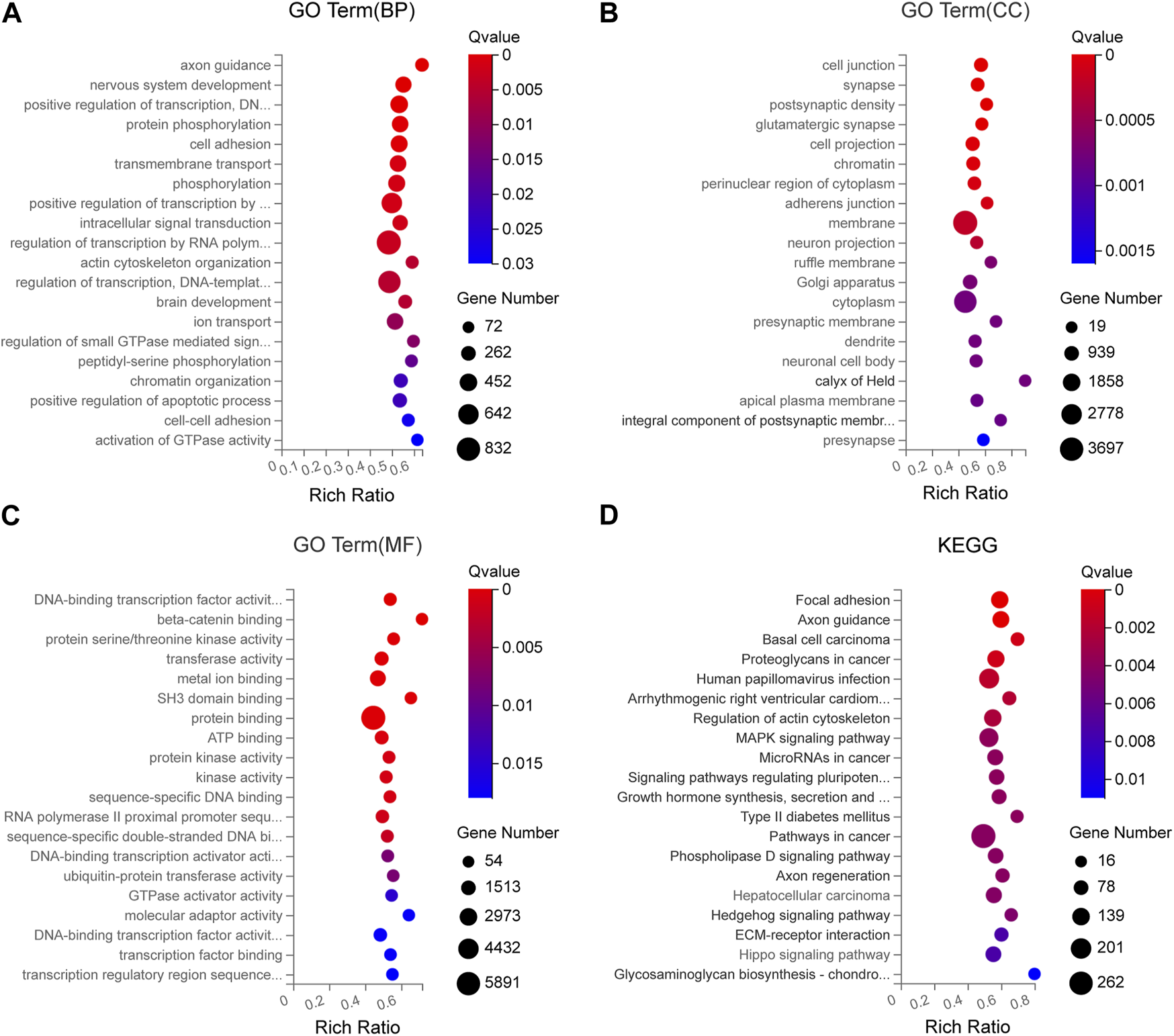 FIGURE 6. GO and KEGG enrichment analyses for the predicted target genes of DEmiRNAs verified by qRT-PCR (A) GO enrichment analysis showing the top 20 most enriched BP related to the target genes (B) GO enrichment analysis showing the top 20 most enriched CC related to the target genes (C) GO enrichment analysis showing the top 20 most enriched MF related to the target genes (D) KEGG enrichment analysis on the predicted target genes. BP: biology process; CC: cellular component; MF: molecular function; GO: Gene Ontology; KEGG: Kyoto Encyclopedia of Genes and Genomes; DEmiRNAs: differentially expressed miRNAs.