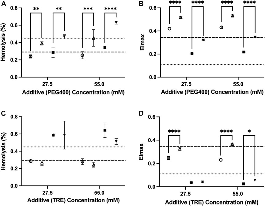 Figure 3. The role of extracellular osmolarity adjustments on the hemolysis and deformability of RBCs stored in PAG3M supplemented with either PEG400 or trehalose for 42 days at 4°C (○:standard; △:osmolarity-adjusted) and −4°C (■: standard; ▼:osmolarity-adjusted). (A) Hemolysis of PEG400-stored RBCs. (B) EImax of PEG400-stored RBCs. (C) Hemolysis of trehalose-stored RBCs. (D) EImax of trehalose-stored RBCs. Dashed lines represent the reference values from the un-supplemented (i.e., 0 mM) conditions, with the heavy dashed line representing values at 4°C and the light dashed line representing values at −4°C. “4°C-adj.” and “-4°C-adj.” indicate the samples for which the osmolarity was adjusted through the removal of either 27.5 mM or 55 mM mannitol. In each case, the amount of mannitol removed was directly related to the concentration of the additive present such that the final osmolarity of the solution was unchanged. All error bars represent the standard deviation of three samples per condition. Error bars are not present in cases where they are smaller than the size of the symbol. Significant differences were calculated using a two-way analysis of variance (ANOVA) followed by a Sidak’s post hoc test: *p < 0.05; **p < 0.01; ***p < 0.001; ****p < 0.0001.