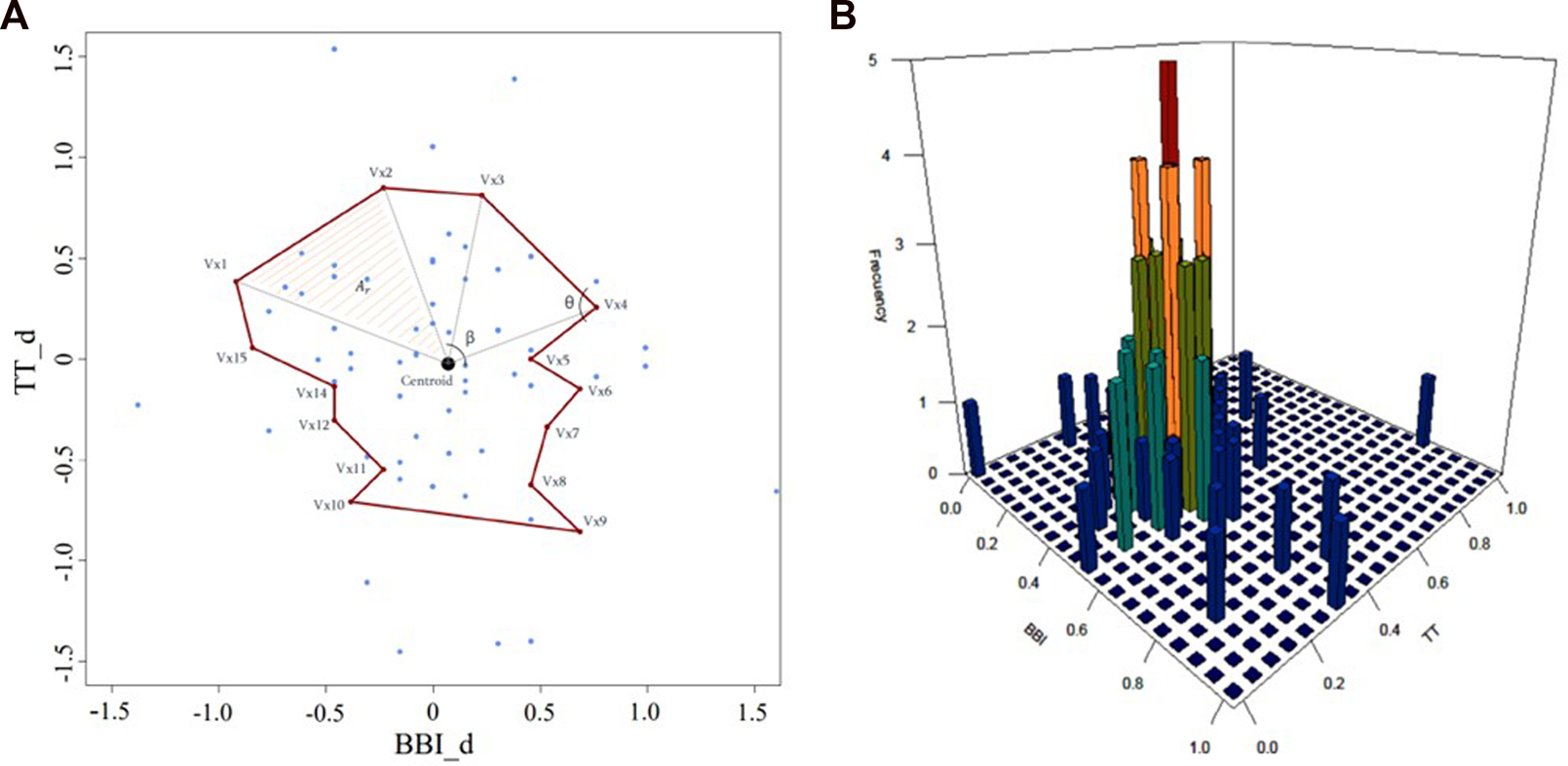 Scatterplot of cardiorespiratory activity for decreasing systolic vascular activity in a CON subject. (A) morphological characterization including : vertices of the polygon; : area of the triangle formed by vertices and , and the centroid; and β: angles formed on the vertex and the centroid, respectively, and (B) statistical characterization.