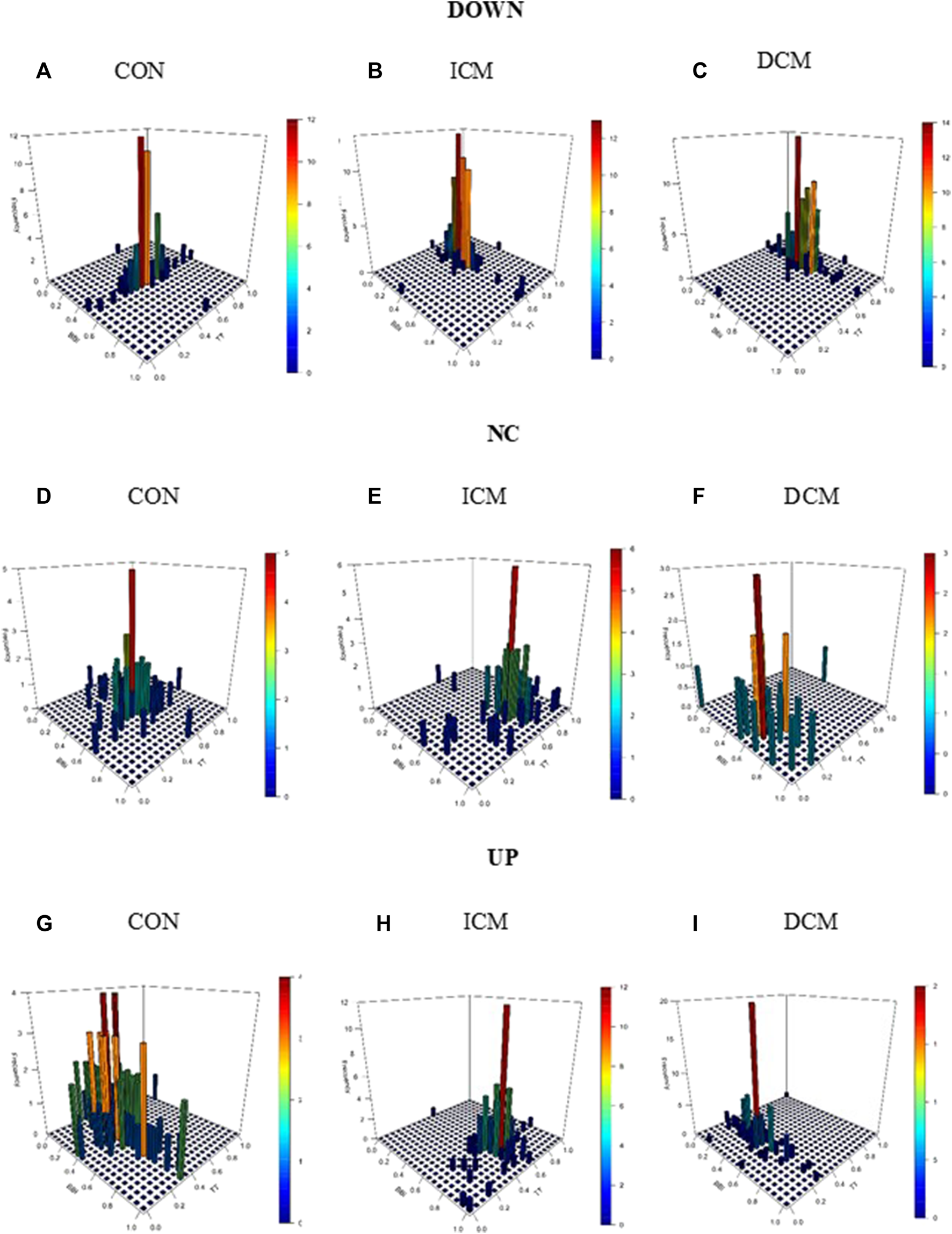 Figure 3 provides an example of the statistical characterization of cardiorespiratory activity based on systolic blood pressure activity according to the different sub-spaces: down (a, b, c), no-change (d, e, f), and up (g, h, i) for a CON subject (a, d, g), an ICM patient (b, e, h), and a DCM patient (c, f, i). Figure 4 illustrates an example of the morphological characterization of cardiorespiratory activity based on systolic blood pressure activity according to the different sub-spaces: down (a, b, c), no-change (d, e, f), and up (g, h, i) for a CON subject (a, d, g), an ICM patient (b, e, h), and a DCM patient (c, f, i).