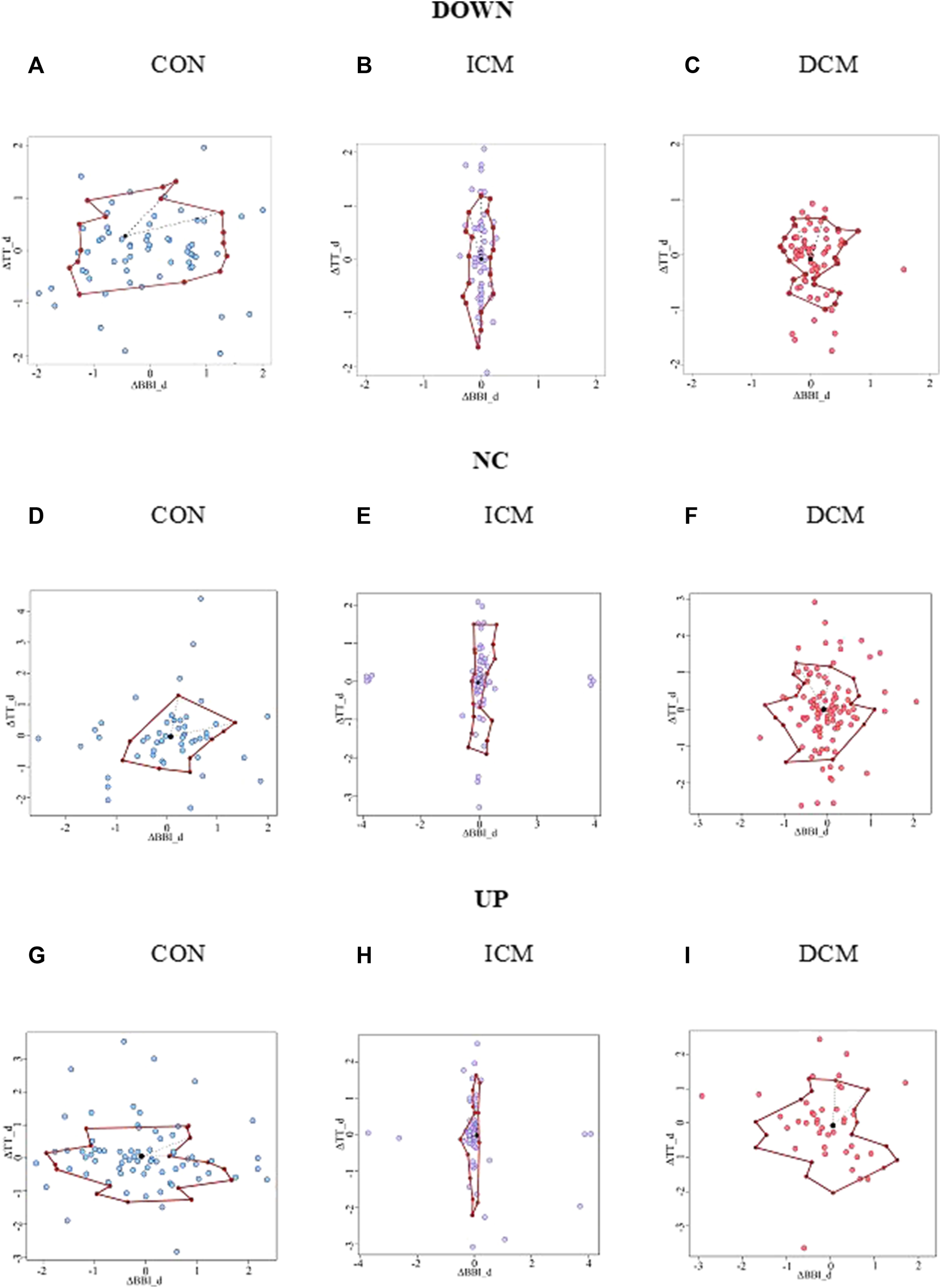Statistical characterization of cardiorespiratory activity based on the sub-space for systolic blood pressure activity: down for (A) CON subject, (B) ICM and (C) DCM patients; no-change for (D) CON subject, (E) ICM and (F) DCM patients; and up for (G) CON subject, (H) ICM and (I) DCM patients.