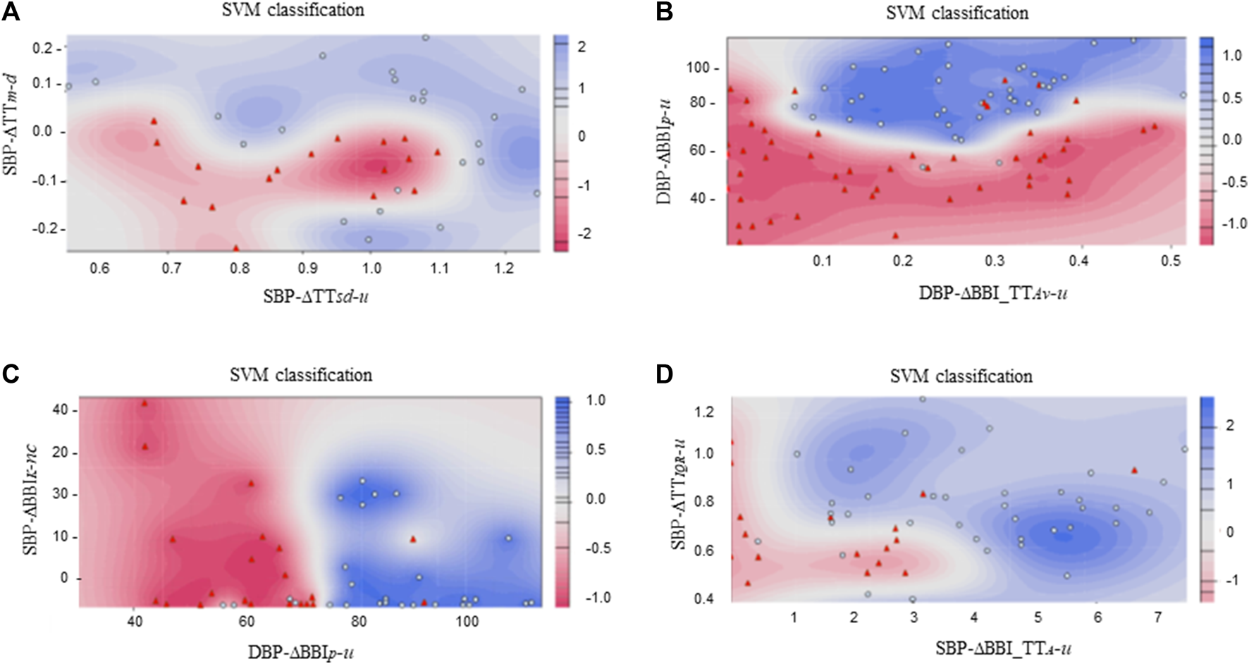 Each feature was scaled and normalized (zero mean and unit variance) in order to avoid scaling biases. For each iteration of features, the model was built by optimizing the value of for each of the kernels considered, by iterating different values of and . The indices that showed statistical differences and low correlation were used in pairs to build several SVM models.