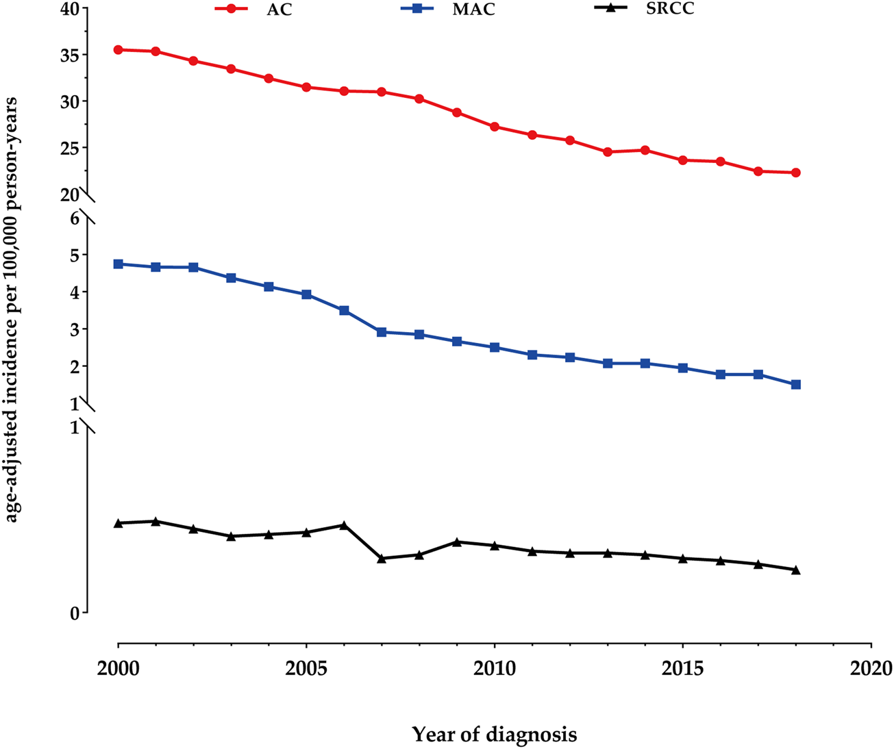The overall age-adjusted incidence of AC during the study period was 28.04 per 100,000 person-years. We observed a 1.6-fold decrease in the incidence, from 35.48 per 100,000 person-years in 2000 to 22.30 per 100,000 person-years in 2018. Similarly, the incidence of MAC showed a 3.2-fold decrease, declining from 4.74 per 100,000 person-years in 2000 to 1.50 per 100,000 person-years in 2018. As for SRCC, the age-adjusted incidence was 0.48 per 100,000 person-years in 2000, which decreased to 0.23 per 100,000 person-years by 2018 (Figure 1).