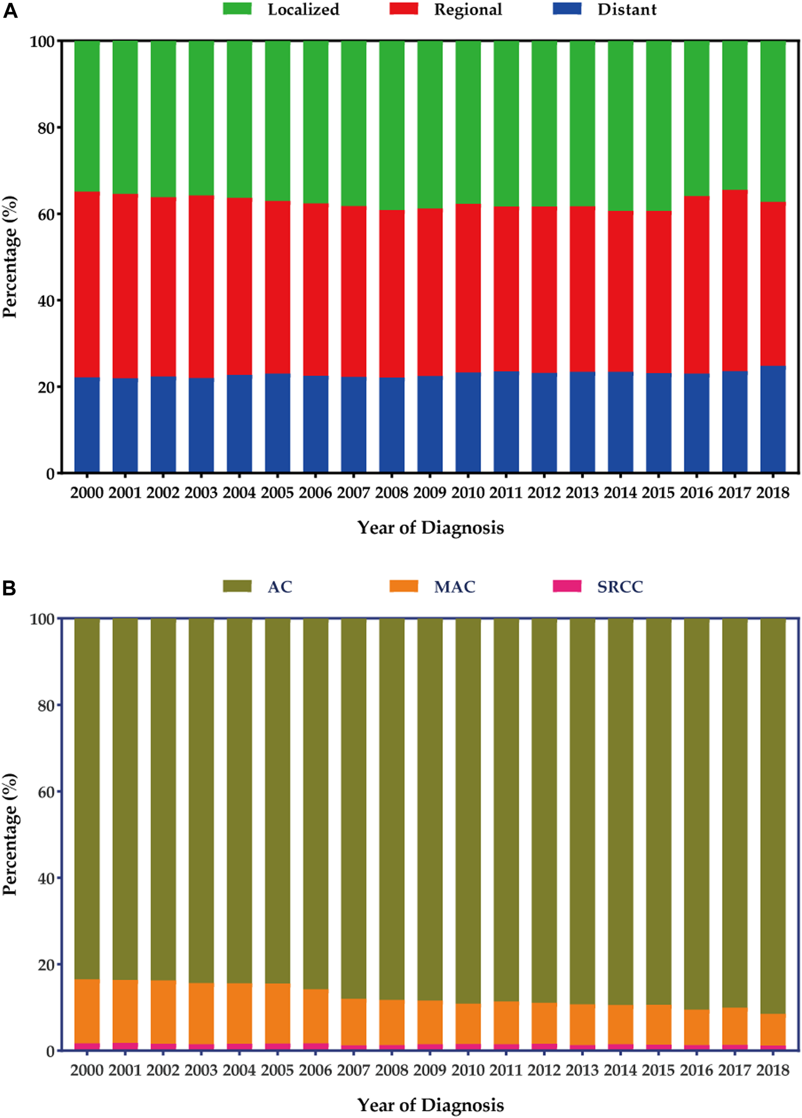 Figure 2 presents the stage and histology distribution of colon cancers for each year during the study period. In the overall cohort, the proportions of distant disease showed a slight increase from 2000 to 2018 (Figure 2A). However, in terms of histology distribution, the proportions of classical AC increased from 2000 to 2018, while the proportions of MAC decreased. On the other hand, the proportions of SRCC in the colon remained relatively stable (Figure 2B).