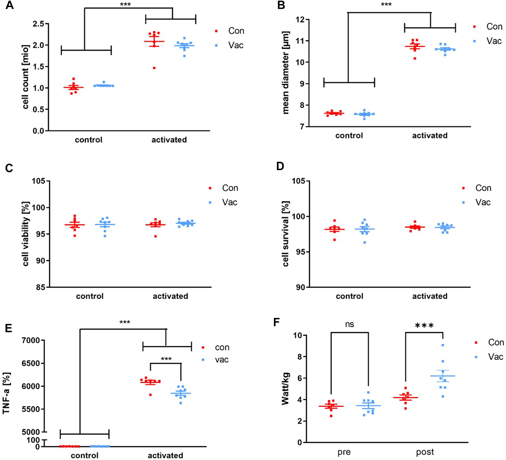 A significant activation-driven effect was detectable for total cell count and cell diameter of the in vitro experiments, but not for viability and survival. We calculated cell survival via the formula: Viability = (100%− viability before culture) + viability after cell culture. Con and Vac measurements were comparable 72-h post-activation (Figures 2A–D; Supplementary Table S1). Likewise, a significant effect for all measured T-cell signature cytokines was found after activation, namely, for IFN-γ, IL-2, IL-4, IL-5, IL-6, IL-10, IL-13, IL-17A, and TNF-α (Supplementary Table S1). However, only the levels for TNF-α significantly differed between Vac vs. Con. Supernatants from Con CD4+ T-cells showed increased TNF-a levels compared to the Vac after the Bonferroni posttest with p > 0.001 (Figure 2E).