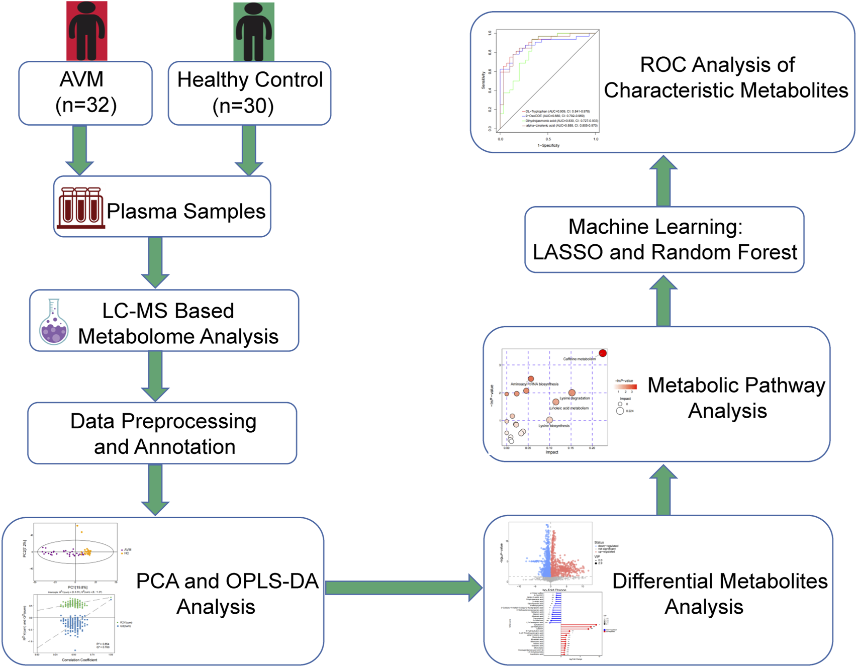 Method: Plasma samples were collected from 32 AVM patients and 30 healthy controls (HC). Ultra-high performance liquid chromatography-mass spectrometry (UHPLC-MS) was employed to analyze the metabolic profiles of both groups. Metabolic pathway enrichment analysis was performed through Kyoto Encyclopedia of Genes and Genomes (KEGG) database and MetaboAnalyst. Additionally, machine learning algorithms such as Least Absolute Shrinkage and Selection Operator (LASSO) and random forest (RF) were conducted to screen characteristic metabolites. The effectiveness of the serum biomarkers for AVM was evaluated using a receiver-operating characteristics (ROC) curve.