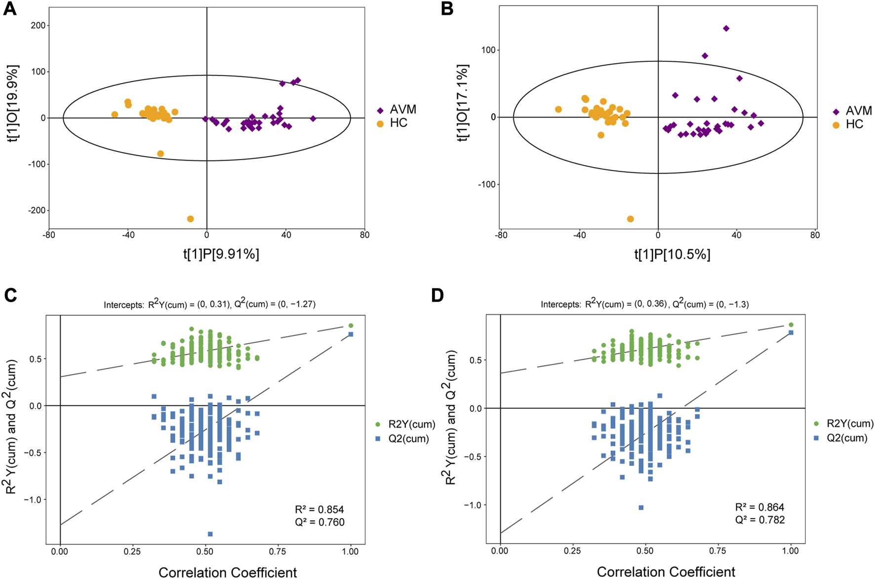 Score scatter plot of the OPLS-DA model for AVM vs. HC group in positive (A) and negative (B) ion mode. Permutation plot test of OPLS-DA model for group AVM vs. HC in positive (C) and negative (D) ion mode.