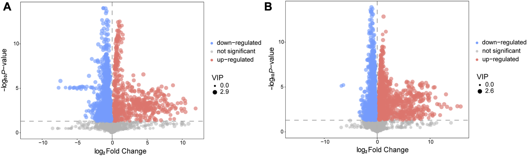 Volcano plot for AVM vs. HC group in positive (A) and negative (B) ion mode. The abscissa represents the log2(Fold Change) of the substance, the ordinate represents the p-value of the Student‘s t-test. The scatter represents the VIP value. Significantly upregulated metabolites are indicated in red, significantly downregulated metabolites are indicated in blue, and non-significantly different metabolites are indicated in grey.