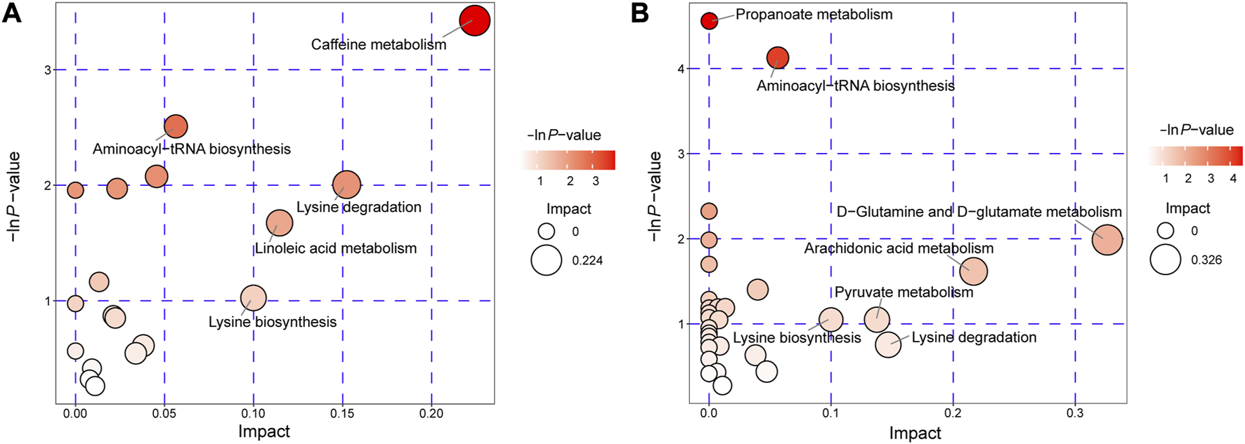 Pathway analysis for AVM vs. HC group in positive ion mode (A) and negative ion mode (B). The abscissa and the size of the bubble represent the size of the influence factor. The ordinate and the color of the bubble represent the p-value of the enrichment analysis.
