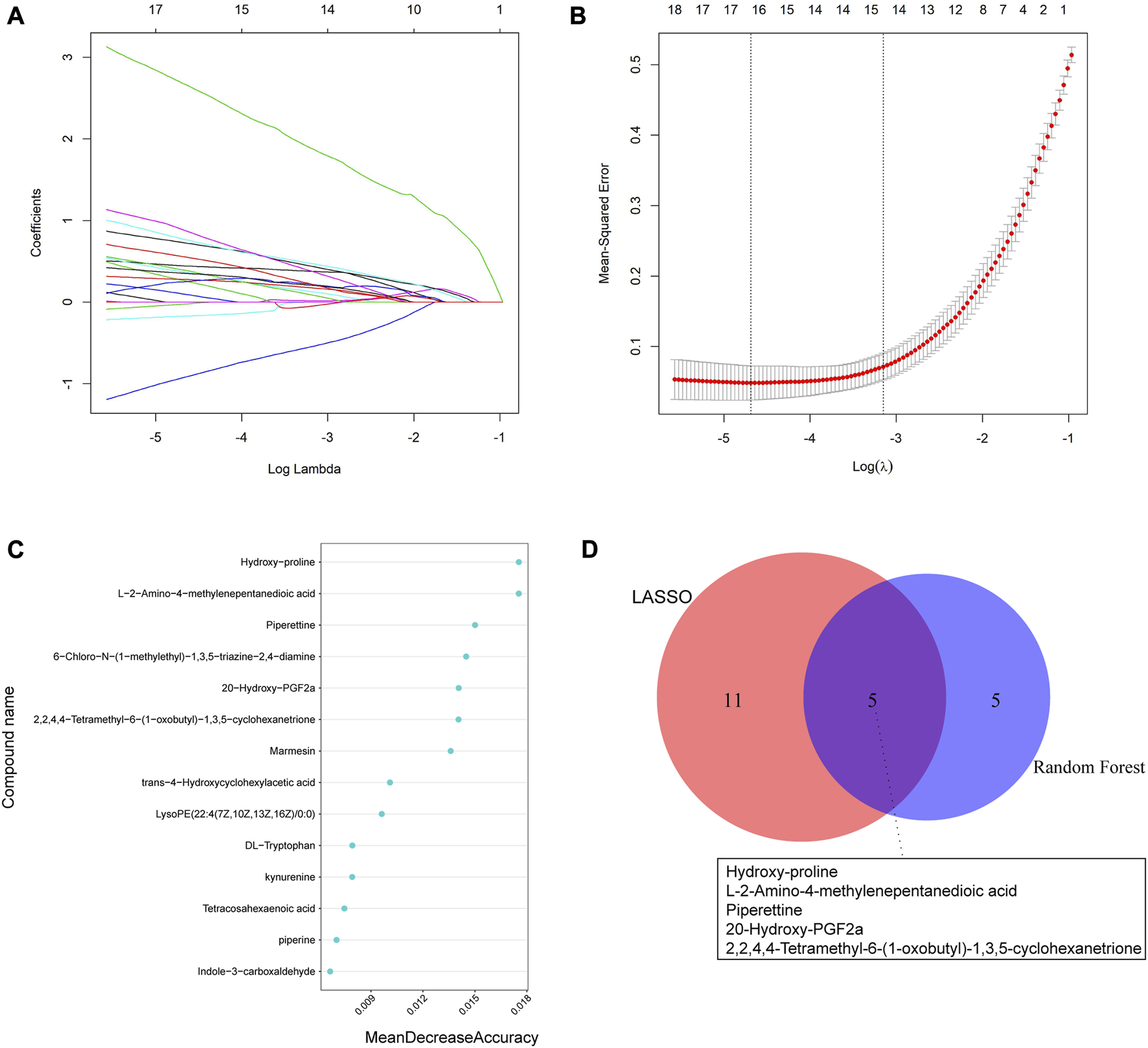 Machine learning algorithms were used to screen characteristic metabolites in the positive ion mode. (A) Coefficient profiles of the metabolites in the LASSO model. (B) A total of 16 non-zero coefficients were obtained using optimal lambda (λ). (C) The top 10 characteristic differential metabolites of the random forest model in the positive ion mode. (D) Venn diagram of characteristic metabolites obtained by the two models.