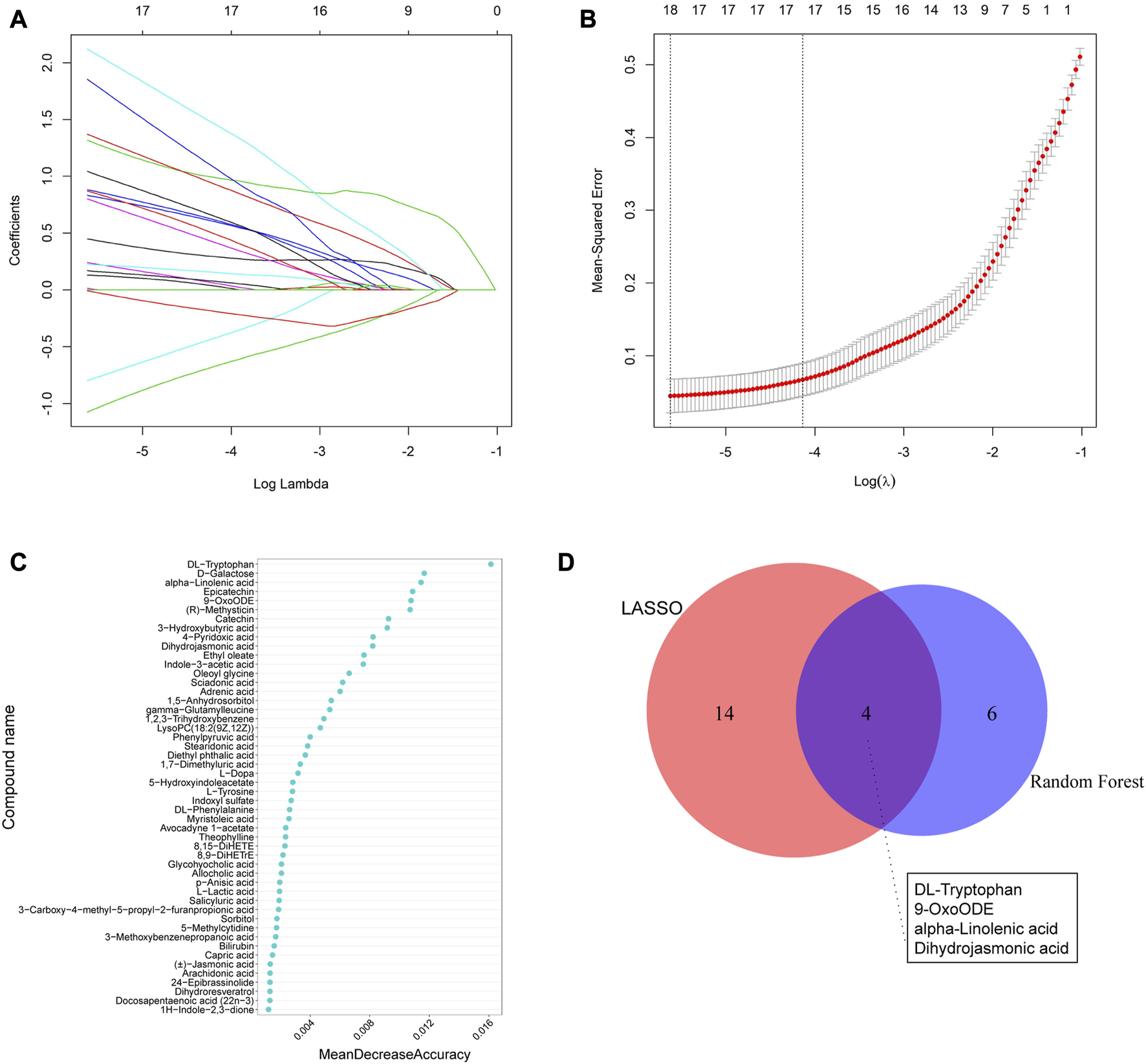 Machine learning methods to screen characteristic metabolites in the negative ion mode. (A) Coefficient profiles of the metabolites in the LASSO model. (B) A total of 18 non-zero coefficients were obtained using optimal lambda (λ). (C) The top 10 characteristic differential metabolites of the random forest model in the positive ion mode. (D) Venn diagram of characteristic metabolites obtained from the two models.