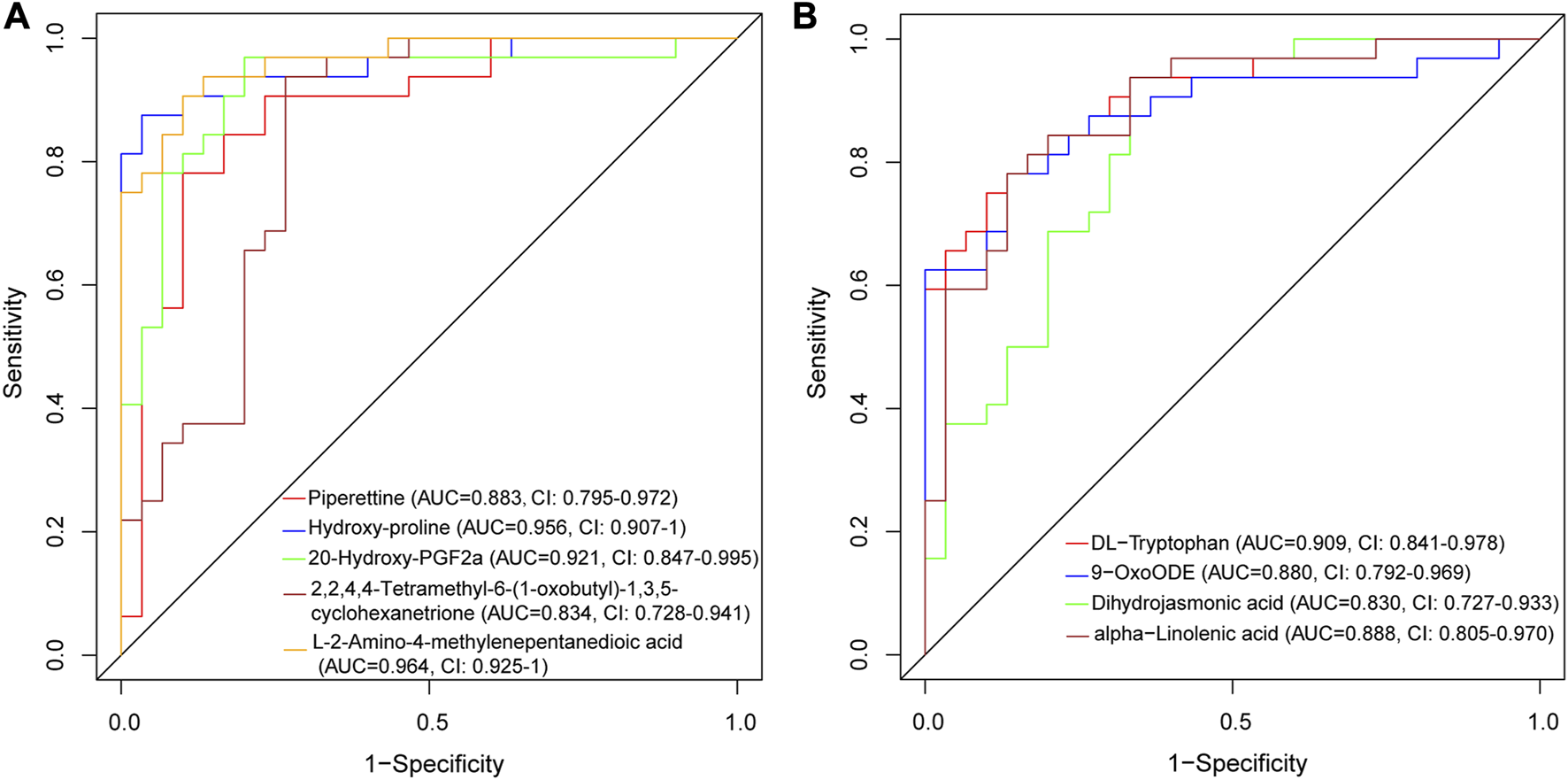 We evaluated the discriminative ability of the metabolites by plotting ROC curves for each metabolite and calculating the AUC. In the positive ion mode (Figure 7A), Piperettine (AUC = 0.883, CI: 0.795-0.972), hydroxy-proline (AUC = 0.956, CI: 0.907-1), L-2-Amino-4-methylenepentanedioic acid (AUC = 0.964, CI: 0.925-1), and 20-Hydroxy-PGF2a (AUC = 0.921, CI: 0.847-0.995) demonstrated high discriminative ability based on their AUCs. Similarly, in the negative ion mode (Figure 7B), DL-Tryptophan (AUC = 0.909, CI: 0.841-0.978), 9-OxoODE (AUC = 0.880, CI: 0.792-0.969), and alpha−Linolenic acid (AUC = 0.888, CI: 0.805-0.970) exhibited high discriminative ability.