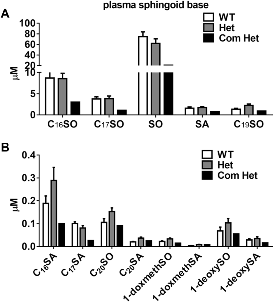 Plasma sphingoid base concentrations in humans with ABCA1 mutations. Sphingoid base profile in subjects with heterozygous mutations in ABCA1 (Het, n = 8), their family controls (WT, n = 6) and a compound heterozygous subject (Com Het, n = 1) (A) C16SO, C17SO, SO, SA, C19SO and (B) C16SA, C17SA, C20SO, C20SA, doxSA, doxSO, doxmethSA and doxmethSO were quantified. SO, sphingosine; SA, sphinganine; doxSA, deoxysphinganine; doxSO, deoxysphingosine; doxmethSA, deoxymethylsphinganine; doxmethSO, deoxymethylsphingosine. Data are presented as mean ± SEM. There were no statistically significant differences between WT and Het subjects by Student’s t-test.