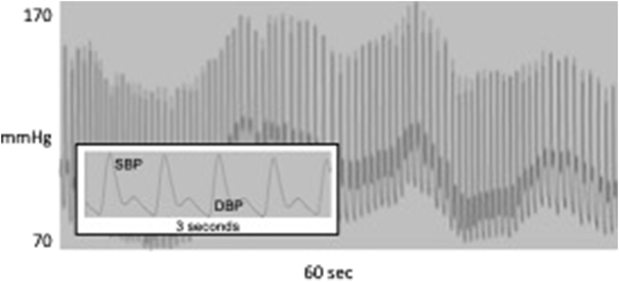 60 s of continuous blood pressure waveform showing oscillation at about 0.05 Hz; inset shows systolic and diastolic BP for 3 s.
