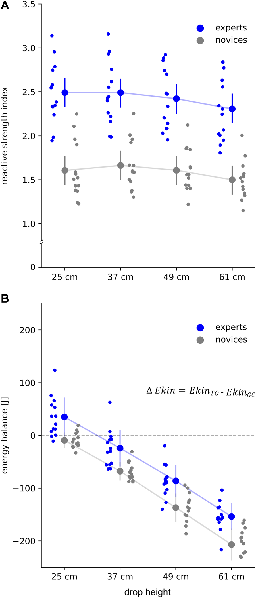 (A) Reactive strength index (RSI = jump height divided by ground contact (GC) time) and (B) energy balance (delta kinetic energy, ∆ Ekin) for all subjects for each drop height. Grand mean and standard deviation are shown for experts (blue) and novices (grey). Positive energy balance represents higher Ekin at take-off () in relation to Ekin at the instant of GC (), while negative values indicate lower Ekin at TO. The subject’s individual means are shown per drop height in the corresponding color.