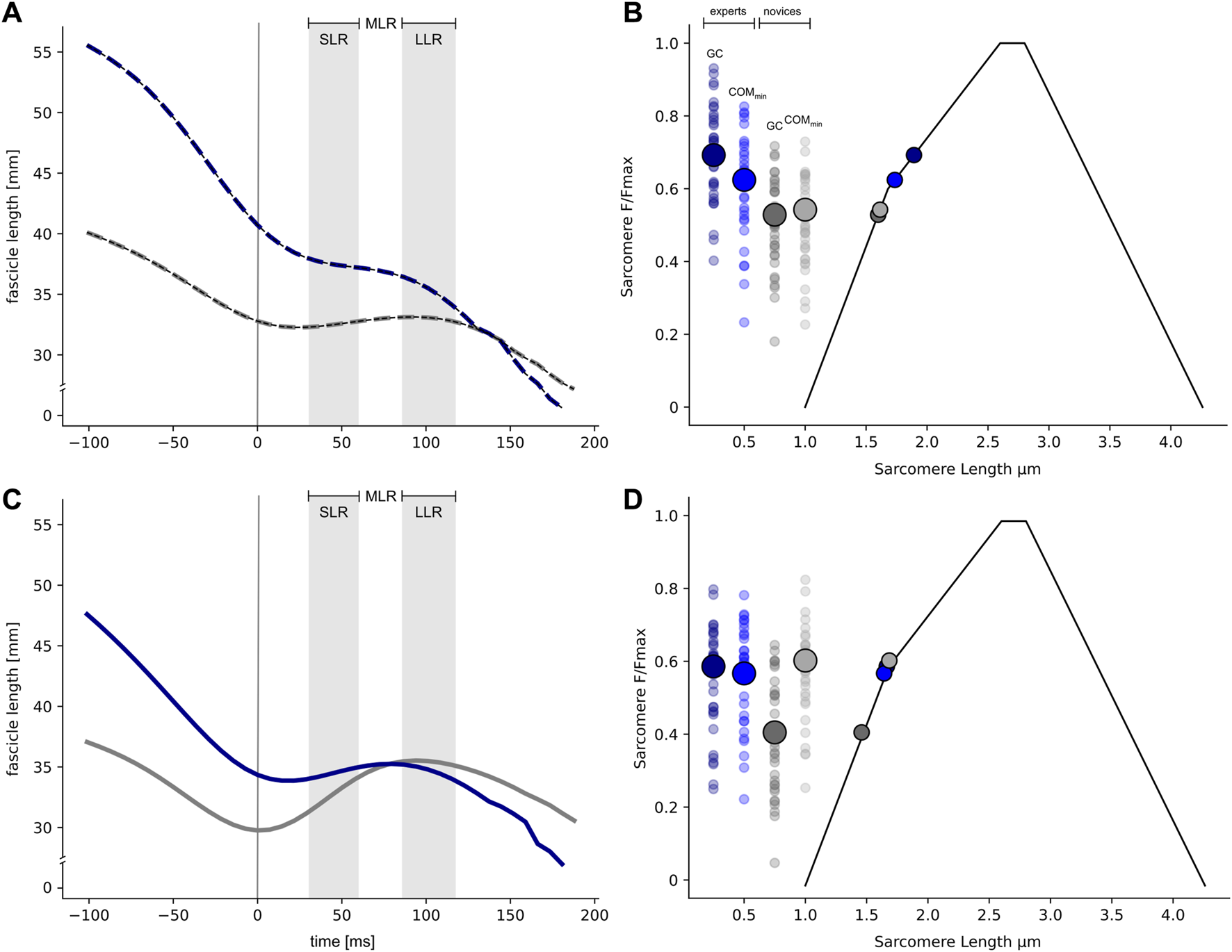 Results: Experts demonstrated significantly higher power output during DJs. Among all drop heights experts realized higher delta Ekin compared to novices. Consequently, higher reactive jump performance shown for experts was characterized by shorter GC time (GCT), higher jump heights and higher neuromuscular activity before and during the GC phase compared to novices. Concomitantly, experts were able to realize highest leg stiffness and delta Ekin in the lowest stretch load; however, both groups compensated the highest stretch load by prolonged GCT and greater joint flexion. On muscle level, experts work quasi-isometrically in the highest stretch load, while in novices GM fascicles were forcefully stretched.