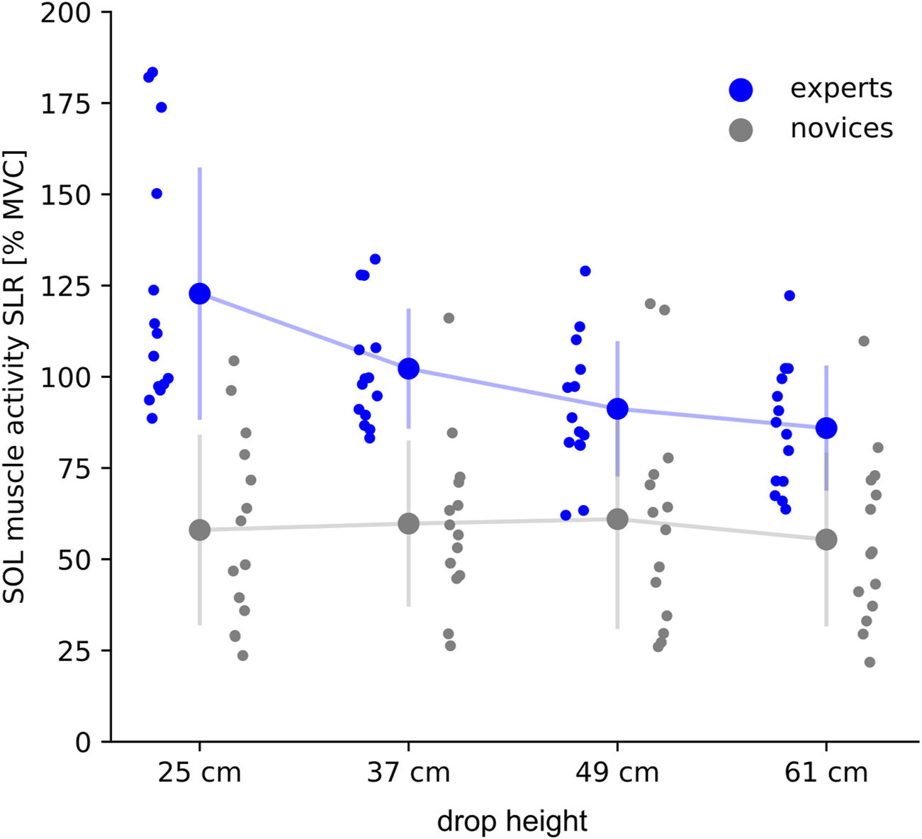 Methods: Experts were compared with novices during reactive drop jumps (DJs) from drop heights ranging between 25 and 61 cm. Delta kinetic energy (Ekin) was calculated as the difference between the Ekin at take-off and ground contact (GC) to determine energy management. By recording electromyography of the lower limb muscles, in vivo fascicle dynamics (gastrocnemius medialis) and by combining kinematics and kinetics in a 3D inverse dynamics approach to compute ankle and knee joint kinetics, this study aimed to compare reactive jump performance, the neuromuscular activity and muscle-tendon interaction between experts and novices among the tested stretch loads.