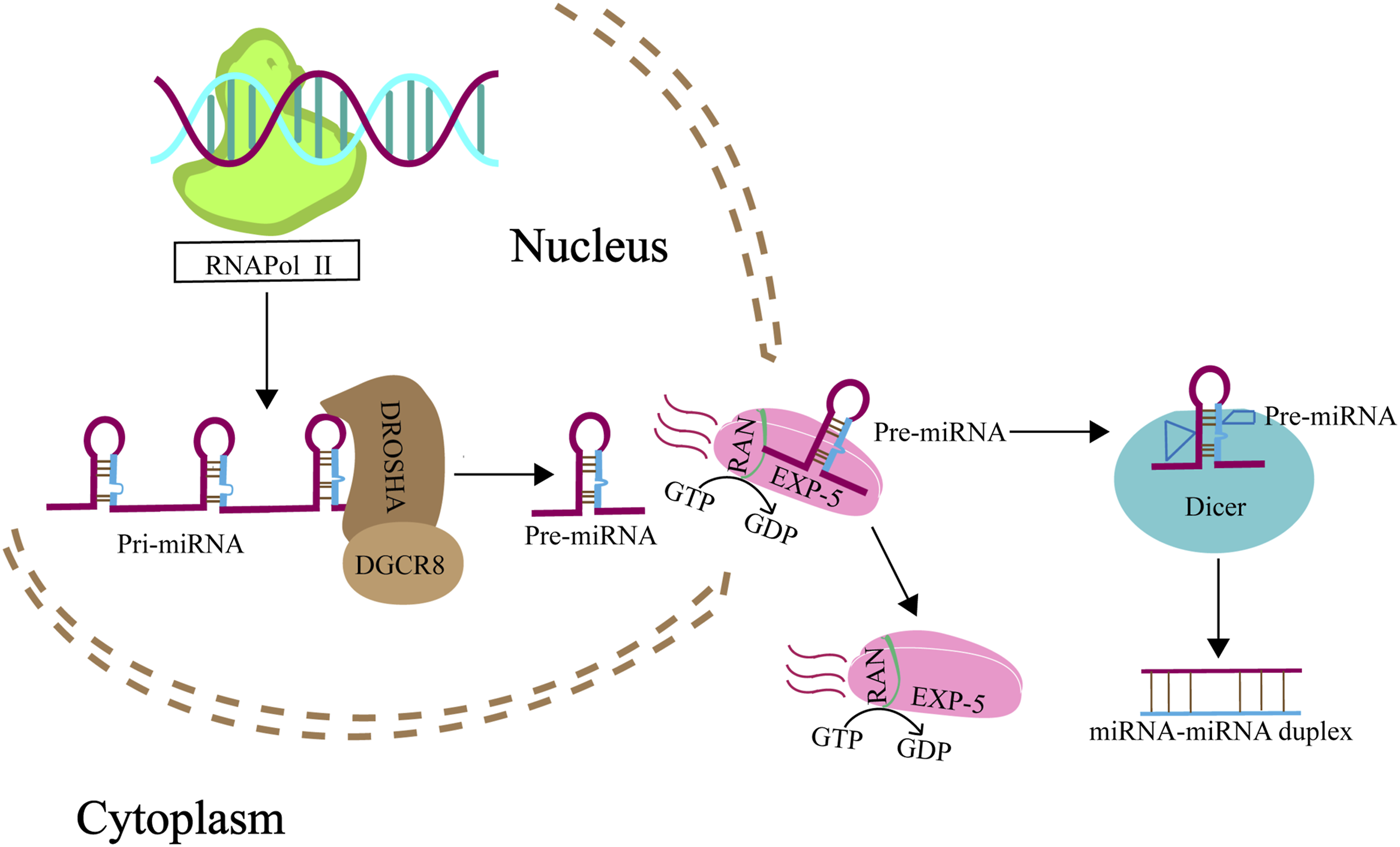 Biogenesis of miRNA. Genes that give rise to miRNAs are transcribed by RNA polymerase II from the noncoding RNA regions of the genome, yielding pri-miRNAs. These pri-miRNAs are then intricately processed into pre-miRNAs through the concerted action of the nuclear RNaseIII Drosha, and its partnering RNA-binding protein, DGCR8. Subsequently, pre-miRNAs are shuttled from the nucleus to the cytoplasm by exportin 5 in association with RanGTP (A GTP-binding nuclear protein), passing through the nuclear pore complexes. Once in the cytoplasm, these pre-miRNAs encounter Dicer, another RNase III enzyme, which meticulously cleaves them into mature miRNA duplexes.