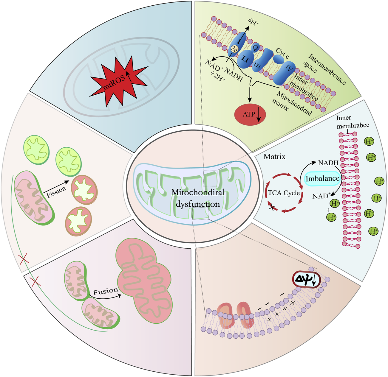 Key factors contributing to mitochondrial dysfunction and cellular senescence. Imbalances in the mitochondrial NAD+/NADH ratio, elevated ROS levels, and diminished ETC, complex activities are primary contributors to mitochondrial dysfunction. Furthermore, disturbances in the equilibrium of mitochondrial division and fusion processes result in structural and functional alterations of mitochondria.