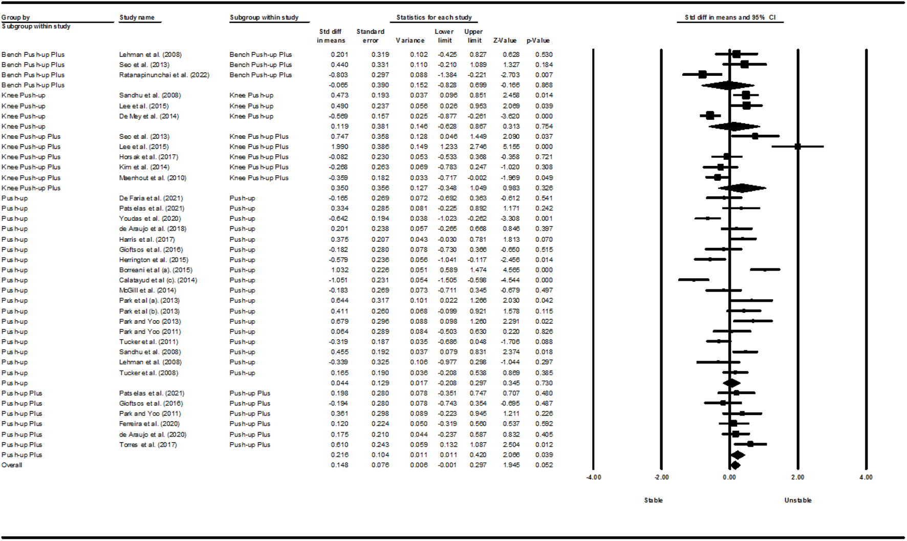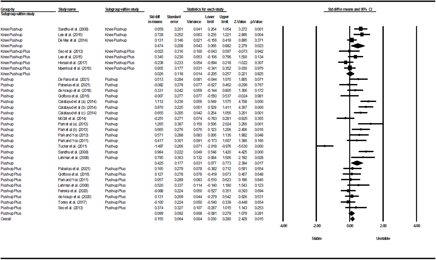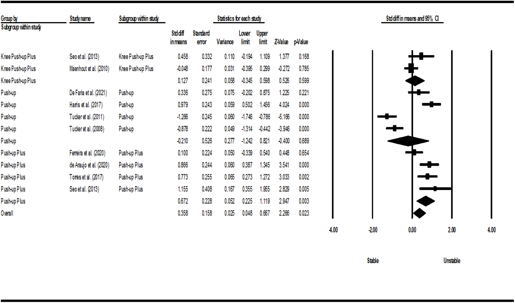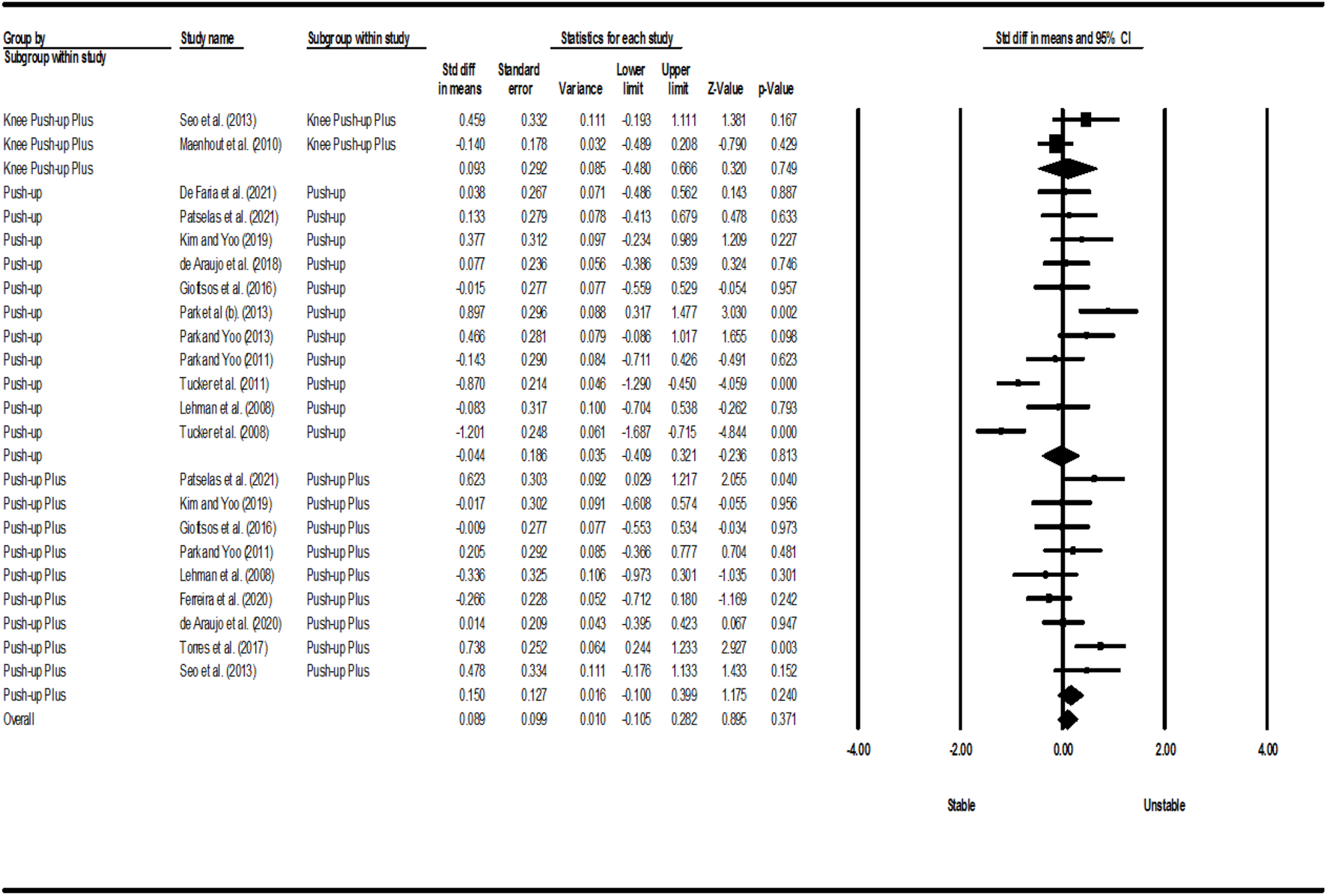 Results: The use of unstable surfaces in people without scapular dyskinesis led to increased activity of the upper trapezius during the PU (p = 0.017; I2 = 84.95%; SMD = 0.425 [95% CI 0.077, 0.773]) and knee PU (p = 0.023; I2 = 70.23%; SMD = 0.474 [95% CI 0.066, 0.882]) exercises and increased activity of the middle trapezius (MT) (p = 0.003; I2 = 64.50%; SMD = 0.672 [95% CI 0.225, 1.119]) and serratus anterior (SA) (p = 0.039; I2 = 4.25%; SMD = 0.216 [95% CI 0.011, 0.420]) muscles during the push-up plus (PUP) exercise.