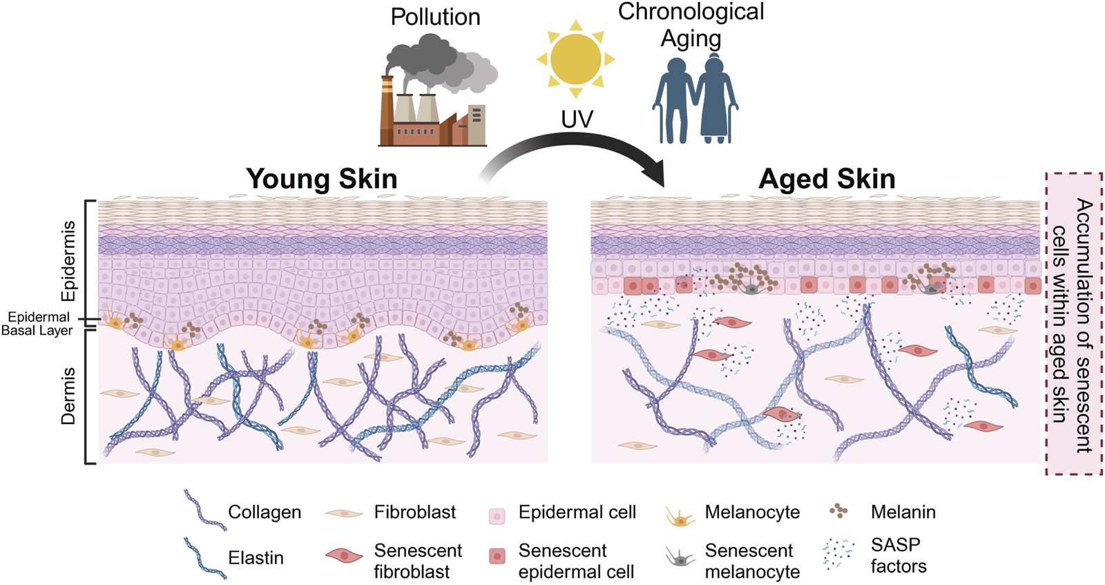 Schematic representation of skin aging. Intrinsic and extrinsic factors (e.g., chronological aging, pollution, UV exposure) result in the accumulation of senescent cells in aged skin. In the aged skin, physiological changes occur—such as thinning of epidermis, flattening of dermal-epidermal junction (DEJ), hyperpigmentation, loss of melanocytes and degradation of collagen and elastin as indicated—that result in the manifestation of various aging phenotypes. Created with BioRender.com.