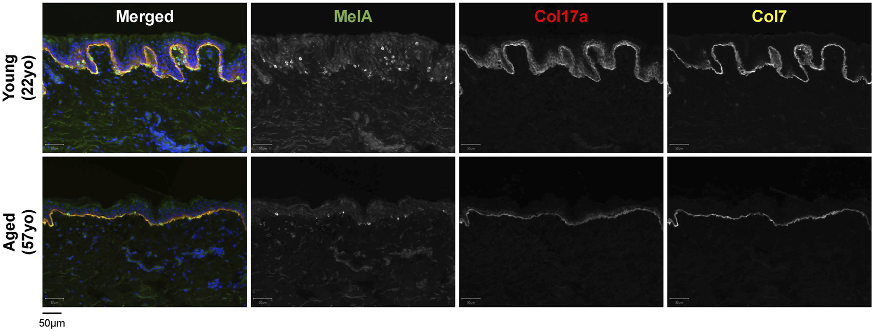 Characteristics of young [22-year-old (22yo)] versus aged [57-year-old (57yo)] sun-protected human skin. Aged skin exhibits a flattened dermal-epidermal junction, decreased number of melanocytes (MelA) and reduced intensity for collagen 17a (Col17a) and collagen 7 (Col7).