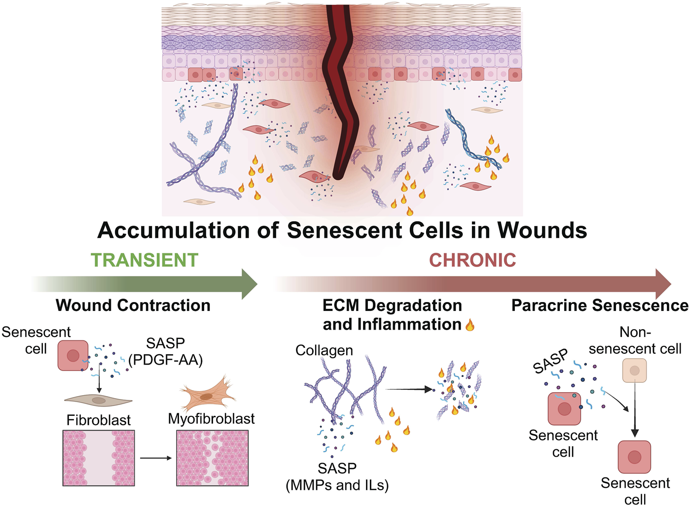 Chronic wounds are a silent epidemic that poses a high economic burden on patients and healthcare systems worldwide (Lindholm and Searle, 2016). Studies have found that elderly individuals are at a higher risk of developing non-healing ulcers due to the accumulation of senescent cells with age, age-related diseases, as well as bodily changes associated with aging (Ferreira Chacon et al., 2010; He and Sharpless, 2017). In addition to the financial burden, chronic wounds lower the quality of life, cause pain and discomfort, limit physical activities and impact mental health (Olsson et al., 2019).