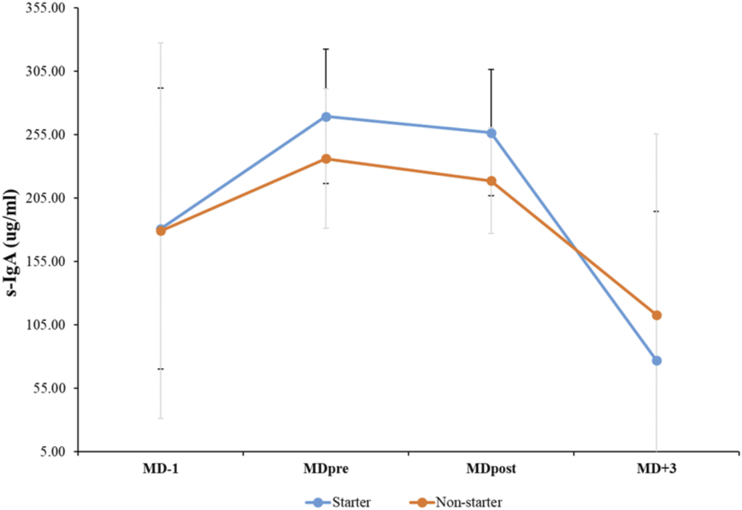 Figure 1 shows the changes in the mean and standard deviation values for s-IgA at four different time points (MD-1, MDpre, MDpost and MD+3). There was a statistically significant main effect of time for s-IgA values (p < 0.001*, F (3,48) = 10.247, ηp2 = 0.390, medium effect). According to Bonferroni test, the mean s-IgA value was found to be significantly lower at MD+3 than at MDpre, with an estimated difference of 157.81 μg/mL (t = 4.885, p < 0.001*, d = 1.15 (0.5–1.7 95% CI, moderate effect). Moreover, a significant decrease in the mean s-IgA value was observed at MD+3 compared to MDpost, with an estimated difference of 142.61 μg/mL (t = 4.126, p < 0.001*, d = 0.97 (0.3–1.5 95% CI, moderate effect)). There were no significant differences observed between starters and non-starters at any time point (p = 0.728, F (1,16) = 0.125, ηp2 = 0.08, small effect). Lastly, the group-by-time interaction had no significant effect on s-IgA (p = 0.630, F (1,16) = 0.581, ηp2 = 0.03, small effect).