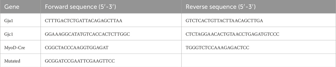 All animal studies were approved by the IACUCs of the University of Alabama, Birmingham (approval #: 21639), and James J. Peters VAMC (approval #: CAR-16-54). We developed a skeletal muscle-restricted Cx43 and Cx45 knockout mouse using a Cre-loxP approach. First, commercially available mice with homozygous floxed Gja1 (encoding Cx43) alleles [Cx43(fl/fl); B6.129S7-IGja1tm1dlg/J, Jackson Laboratory, strain #008039] were bred with mice with homozygous floxed Gjc1 (encoding Cx45) alleles [Cx45(fl/fl)] provided by Dr. James Nagy (Maxeiner et al., 2005), University of Manitoba, to generate Cx43(fl/fl)/Cx45(fl/fl) mice. To generate the conditional knockouts, Cx43(fl/fl)/Cx45(fl/fl) mice were bred with commercially available mice with a heterozygous Cre recombinase knock-in placed in the first exon of Myod1 [MyoD-Cre(+/−); FVB.Cg-Myod1tm2.1(icre)Glh/J; Jackson Laboratory, strain #014140] to create a MyoD-Cre(+/−)-Cx43(fl/fl)/Cx45(fl/fl) mouse, hereafter referred to as “mKO.” The genotype controls were littermates with no MyoD-Cre alleles, hereafter referred to as “Con”. Cx43(fl/fl) and MyoD-Cre(+/−) were chosen as they are commercially available and have been utilized successfully across multiple physiological domains; Cx45(fl/fl) had no commercial vendor. MyoD-Cre(+/−) was selected as it has been demonstrated to successfully activate Cre-loxP systems in a muscle-specific manner.