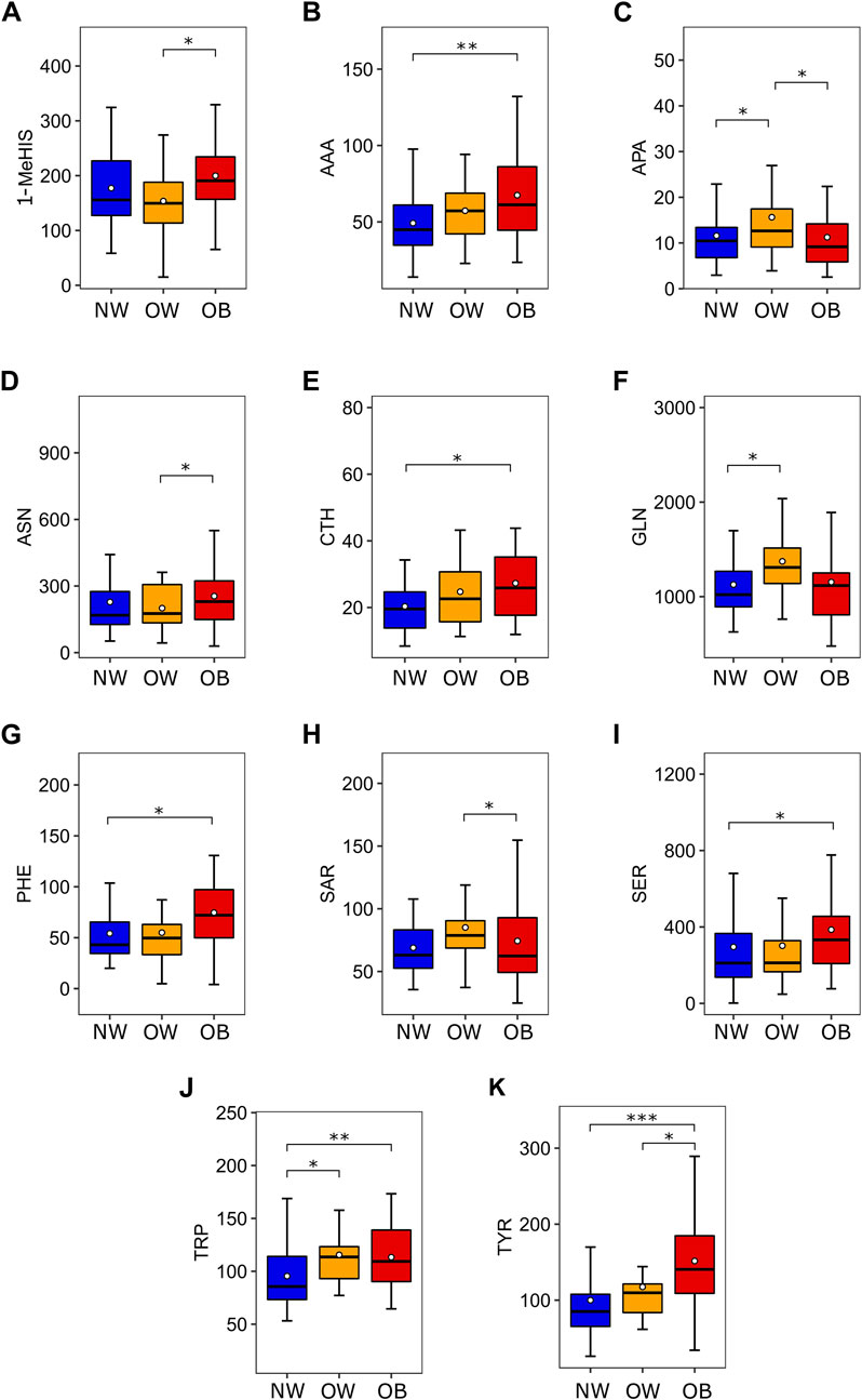 Figure 1. Amino acids which are differentially expressed according to nutritional status. (A) 1-MeHIS concentration in urine (nmol/mg of urinary creatinine) according to nutritional status. ANOVA (p = 0.047) followed by Tukey HSD (OW ≠ OB). (B) AAA concentration in urine (nmol/mg of urinary creatinine) according to nutritional status. Kruskal-Wallis (p < 0.01) followed by Benjamini-Hochberg (NW ≠ OB). (C) APA concentration in urine (nmol/mg of urinary creatinine) according to nutritional status. Mood’s Median Test (p = 0.046) followed by Pairwise median test (NW ≠ OW and OW ≠ OB). (D) ASN concentration in urine (nmol/mg of urinary creatinine) according to nutritional status. Mood’s Median Test (p = 0.049) followed by Pairwise median test (OW ≠ OB). (E) CTH concentration in urine (nmol/mg of urinary creatinine) according to nutritional status. Kruskal-Wallis (p = 0.015) followed by Benjamini-Hochberg (NW ≠ OB). (F) GLN concentration in urine (nmol/mg of urinary creatinine) according to nutritional status. Mood’s Median Test (p = 0.029) followed by Pairwise median test (NW ≠ OW). (G) PHE concentration in urine (nmol/mg of urinary creatinine) according to nutritional status. Kruskal-Wallis (p < 0.01) followed by Benjamini-Hochberg (NW ≠ OB). (H) SAR concentration in urine (nmol/mg of urinary creatinine) according to nutritional status. Mood’s Median Test (p = 0.024) followed by Pairwise median test (OW ≠ OB). (I) SER concentration in urine (nmol/mg of urinary creatinine) according to nutritional status. Kruskal-Wallis (p = 0.049) followed by Benjamini-Hochberg (NW ≠ OB). (J) TRP concentration in urine (nmol/mg of urinary creatinine) according to nutritional status. Kruskal-Wallis (p < 0.01) followed by Benjamini-Hochberg (NW ≠ OW and NW ≠ OB). (K) TYR concentration in urine (nmol/mg of urinary creatinine) according to nutritional status. Kruskal-Wallis (p < 0.001) followed by Benjamini-Hochberg (NW ≠ OW and NW ≠ OB). Post-hoc tests: *p < 0.05, **p < 0.01, and ***p < 0.001. Abbreviations: 1-MeHIS, 1-methyl-histidine; AAA, alpha-aminoadipic acid; APA, alpha-aminopimelic acid; ASN, asparagine, CTH, cystathionine; GLN, glutathione; PHE, phenylalanine; SAR, sarcosine; SER, serine; TRP, tryptophan; TYR, tyrosine; NW, normal weight; OW, overweight; OB, obesity.