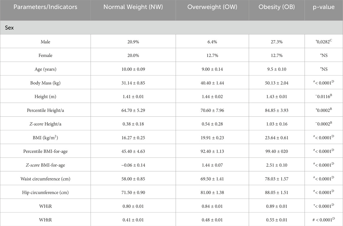 Table 1. Anthropometric parameters and growth indicators according to the nutritional status of prepubescent children. Numbers within parentheses indicate the sample size. kg = kilograms, m = meters, cm = centimeters, BMI = Body Mass Index; WHiR = waist-to-hip ratio; WHtR = waist-to-height ratio; NS = non-significant. #Mood’s median test and Pairwise median test. *Kruskal-Wallis and Dunn’s Test. ¨ANOVA and Tukey HSD.B Normal Weight ≠ Obesity;C Overweight ≠ Obesity;D All groups differ from each other.