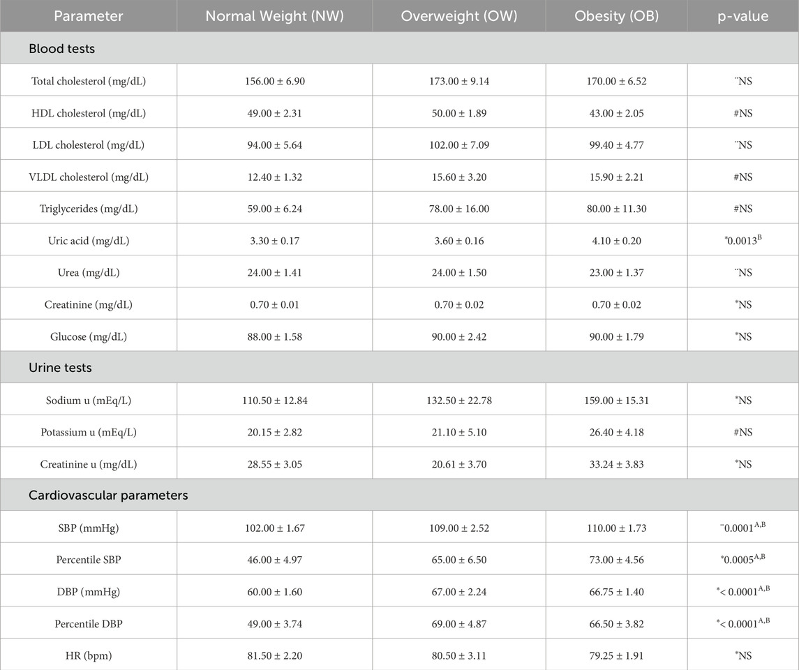Table 2. Distribution of cardiovascular parameters, and biochemical tests according to nutritional status. “u” = urine sample measurement SBP = systolic blood pressure; DBP = diastolic blood pressure; HR = heart rate; NS = non-significant. #Mood’s median test and Pairwise median test. *Kruskal-Wallis and Dunn’s Test. ANOVA and Tukey HSD. (A) Normal Weight ≠ Overweight; (B) Normal Weight ≠ Obesity; (D) All groups differ from each other.