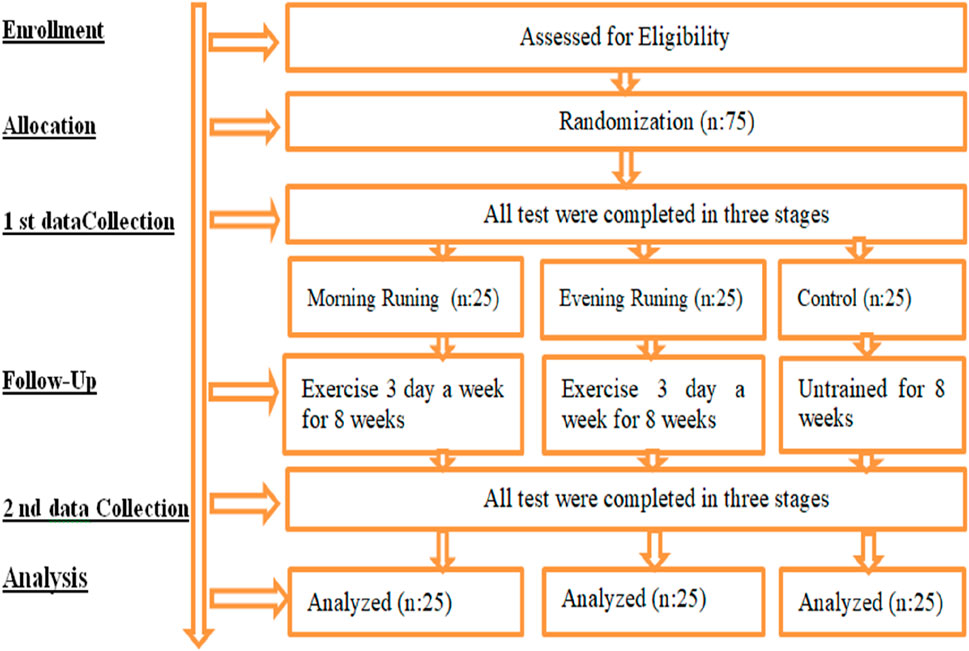 The aim of this study was to investigate the effects of morning and evening running training on lower extremity strength, agility performance and respiratory function in 50 male football players aged 10-12 years who have been training regularly for at least 2 years. The control group consisted of 25 athletes. A total of 75 children aged 10-12 years participated in our study. Power analysis was performed with the G.Power 3.1 program to determine the sample size of the study and the d value was found to be 1.12 (α = 0.05, 1-β = 0.95, η2p = 0.8). As a result of the analysis, it was decided to include at least 25 participants in each group. The study was divided into three groups: morning running (MRI), evening running (ERG) and control (CON). Our study included individuals who had been doing sports for 2 years. No medication was used before the study. Individuals with illness or disability were excluded from the study.