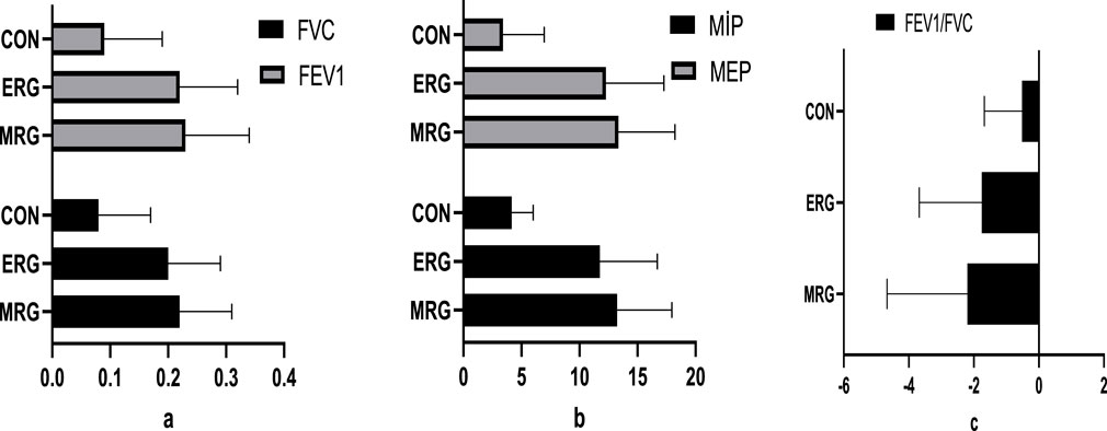 The results of our study indicated that morning running was more effective than other types of exercise in improving respiratory function. Participants in the morning running group showed greater improvements in forced vital capacity (FVC) (10.18%), forced expiratory volume in one second (FEV1) (11.16%), maximal inspiratory pressure (MIP) (15.80%), and maximal expiratory pressure (MEP) (14.55%) compared to the other groups (p < 0.001; Figure 3).