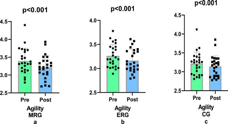 In our study, it was found that agility scores improved more in the morning running group (−5.01%) compared to the evening (−3.06%) and control (−2.48%) groups following the 8-week running training program (p = 0.001, ηp2 = 0.186; Figure 4).