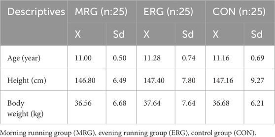 Huguet et al. (1995) reported that morning (8:30–10:30) runs were more effective in 9–11-year-old children in standing and seated sprint runs, according to the other time of day. Furthermore, they reported that the peak time performance of children would differ from that of adults (Huguet et al., 1995). In their 2012 study, Souissi and colleagues investigated the impact of time-specific training on daily performance fluctuations in boys (10-11 age). They reported that training programs conducted in the morning (7:00–8:00) and evening (17:00–18:00) groups demonstrated increased muscle strength and power gains following training, particularly during the morning hours. Furthermore, the anaerobic performance of the male subjects was superior to that of the female subjects in the morning training programs (Souissi et al., 2012).